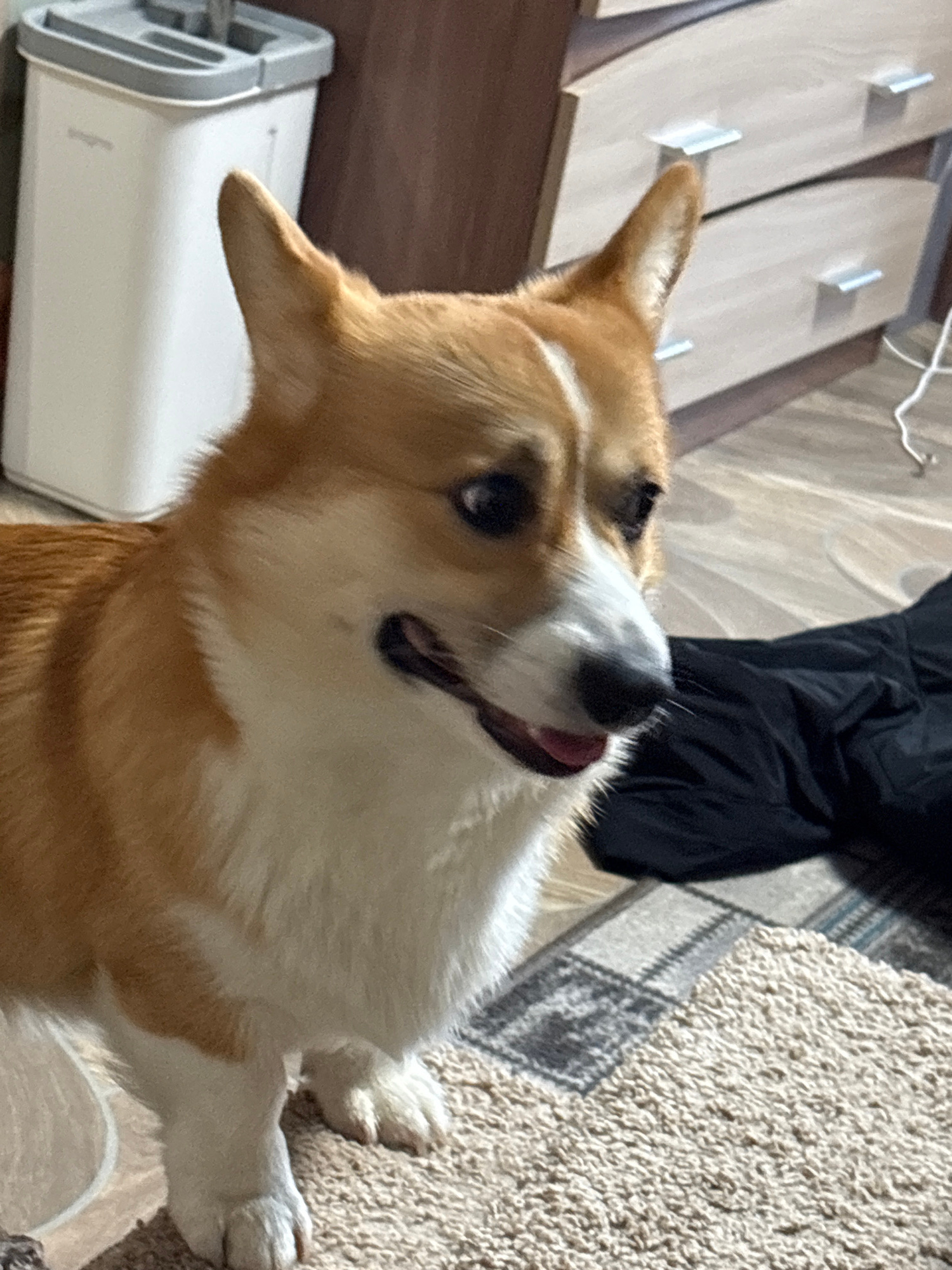 A tan and white corgi dog is lying on a carpet, with its head angled upwards. A black jacket is partially visible in the background, as well as some light wooden panels with silver hardware. A white h…read more