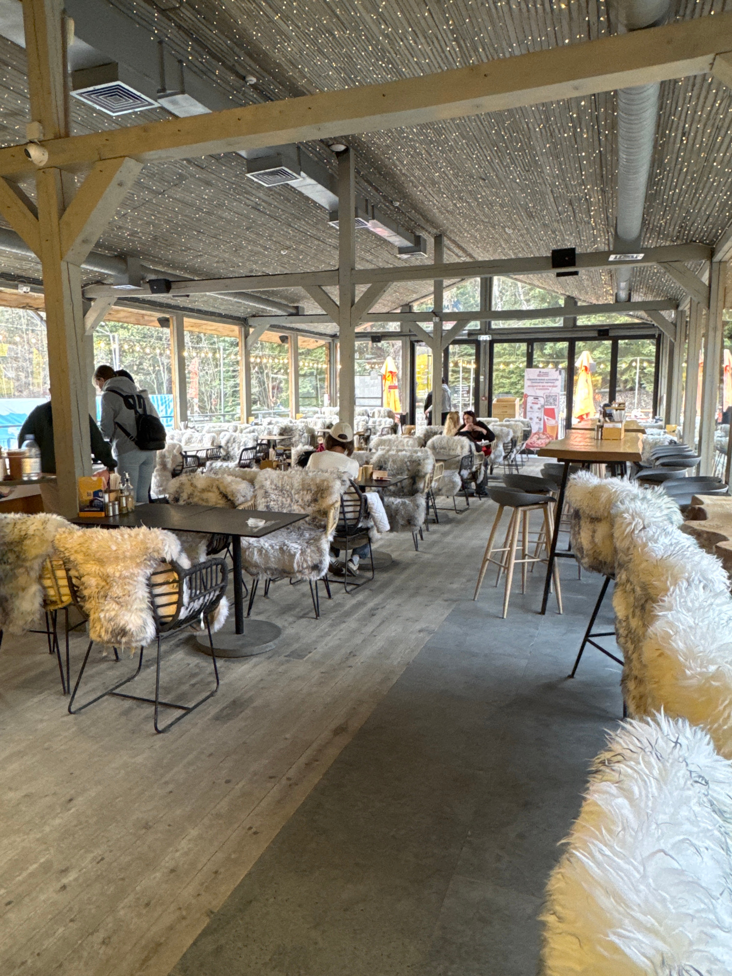 The image captures an inviting indoor dining or lounge area, likely a cafe or restaurant, characterized by a rustic yet cozy aesthetic. The space features numerous wooden support beams and a wooden ce…read more