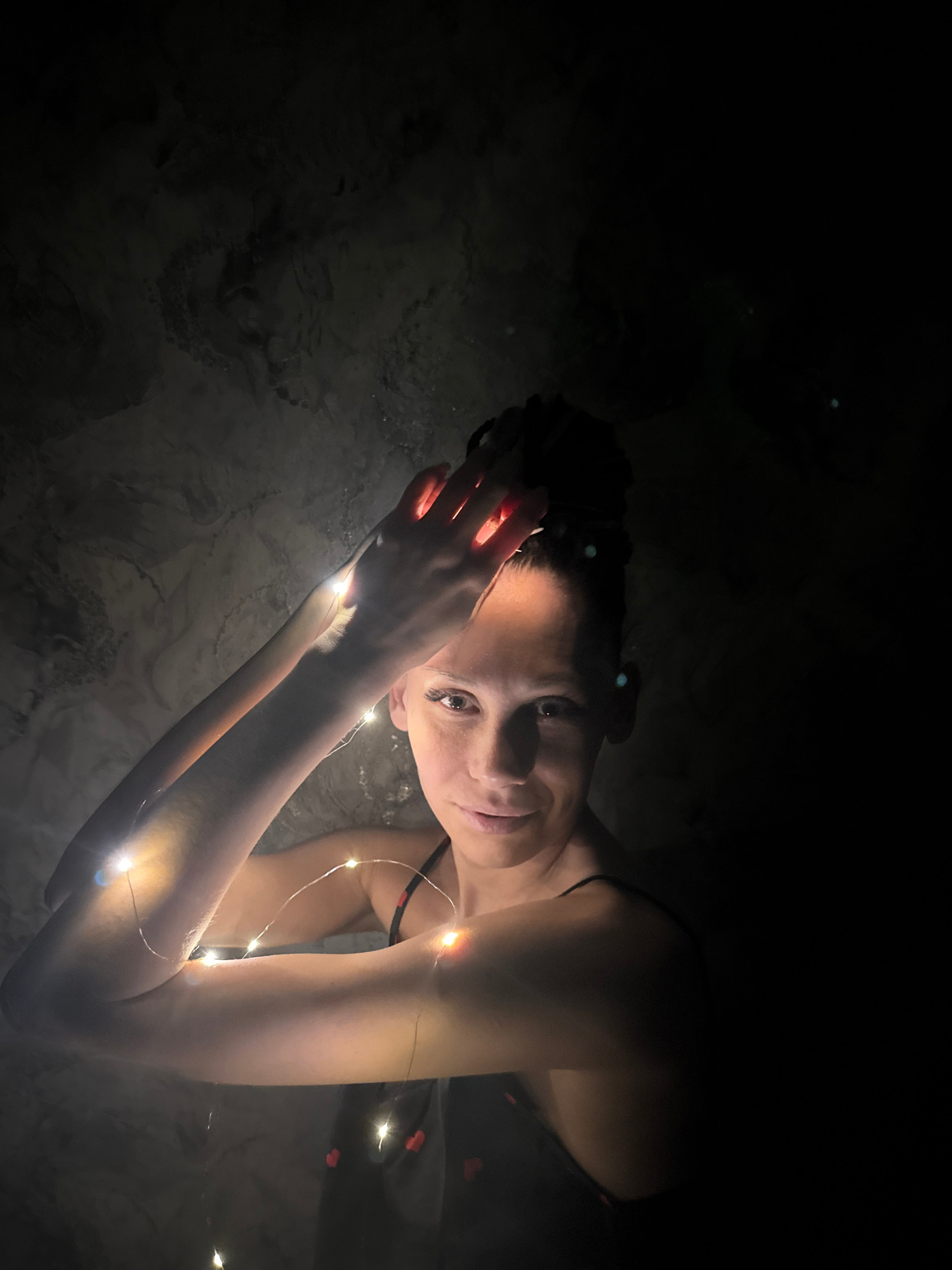 A woman is lying in water, possibly a bathtub or shallow pool, in a dimly lit environment. She is positioned at an angle, looking towards the camera with a slight smile. Fairy lights are draped acrossβ¦read more