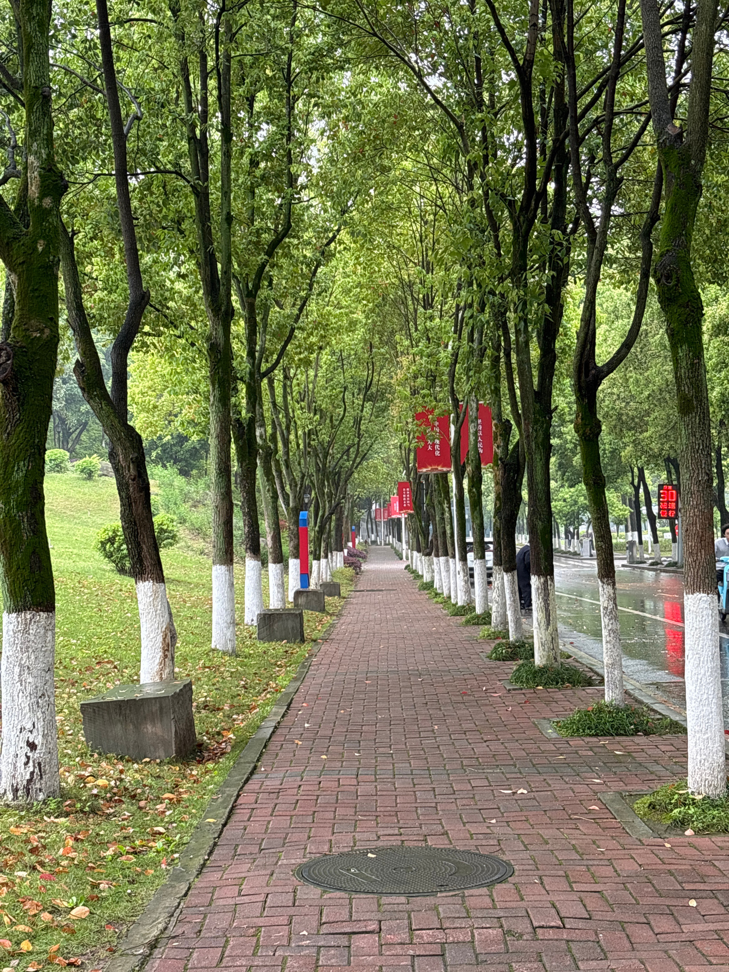 A ground-level, angled perspective shows an avenue with a brick-paved walkway lined with trees, typical of urban areas. The trees, marked with white paint on their lower trunks, form a canopy over the…read more