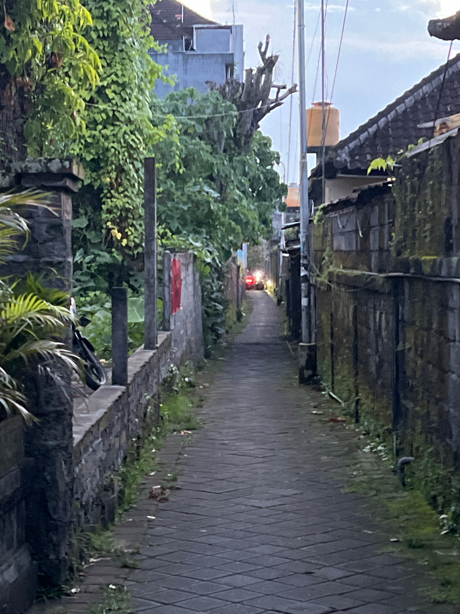 This image depicts a narrow alleyway in Ubud, Indonesia. The alley is paved with dark, patterned stones, suggesting a pedestrian walkway. Buildings line both sides of the path, their structures appear…read more