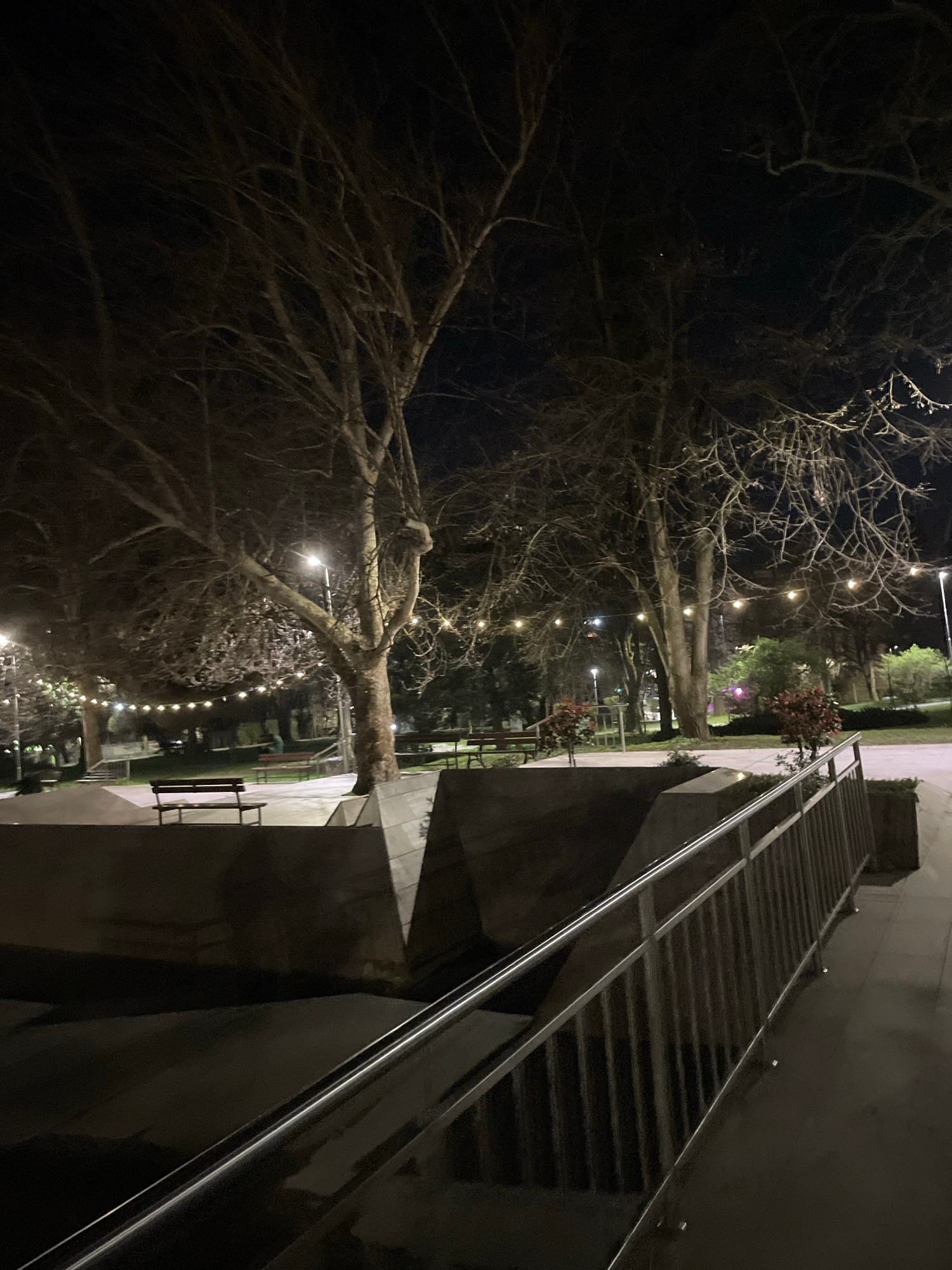 The image depicts an outdoor scene at night in Veliko Tarnovo, Bulgaria. A set of stairs with metal railings occupies the right side of the frame, ascending out of view. A leafless tree with string li…read more