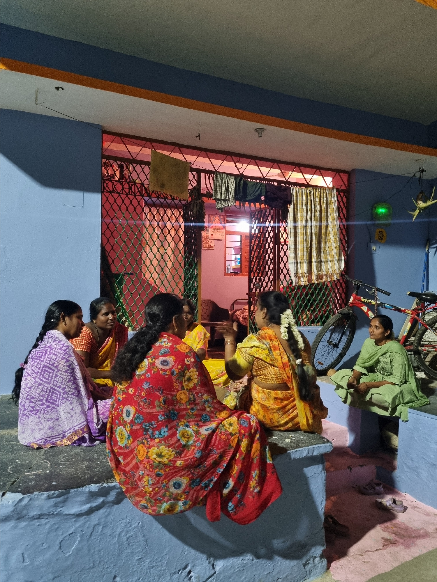 Captured in Pedda Kammavaripalli, India, the image presents a group of women gathered indoors, seated on a series of concrete steps. Five women are visible in the foreground, clad in colorful sarees of red, yellow, and purple hues. They are positioned close together, their heads bowed as if engaged in a task or conversation. Another woman is situated on a higher step, wearing a green outfit, seemingly observing the group. Behind the women, a red-painted metal gate is visible, leading to a dimly lit interior. A bicycle is propped against the wall above the women, near a green indicator light. The walls are painted in shades of blue and gray. The atmosphere suggests a domestic setting, possibly a home or community gathering place. | Open Wire