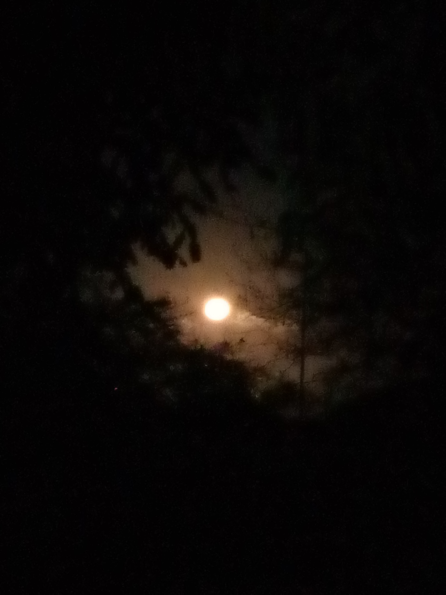 The image shows a full moon at night, partially obscured by dark tree branches. The moon is the brightest object in the scene, radiating a soft yellow light. The background is predominantly dark, with…read more