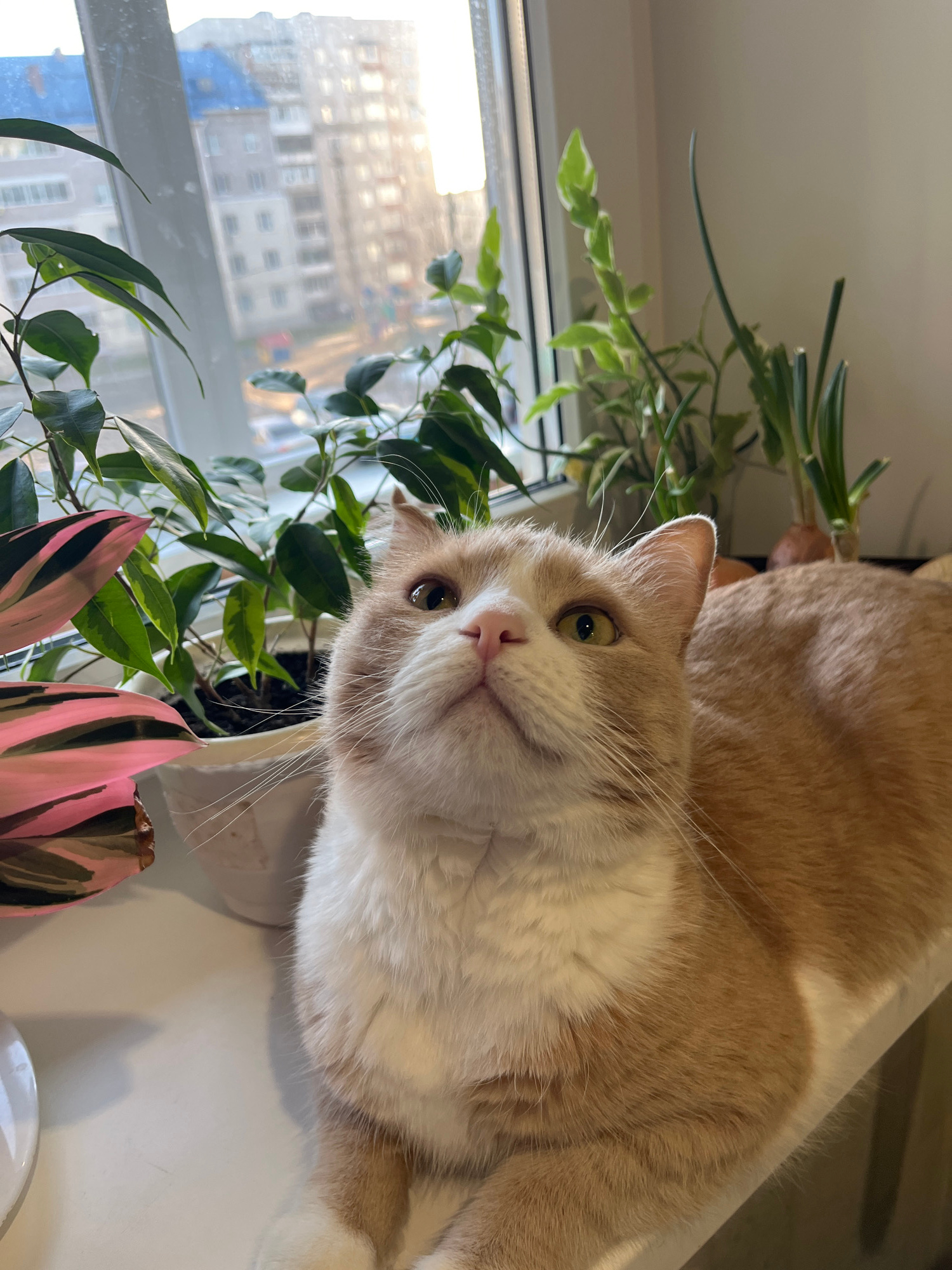 An indoor shot captures an orange and white cat lying on a white surface, possibly a windowsill or table, looking directly at the camera. The cat has prominent whiskers, green eyes, and a pink nose. I…read more