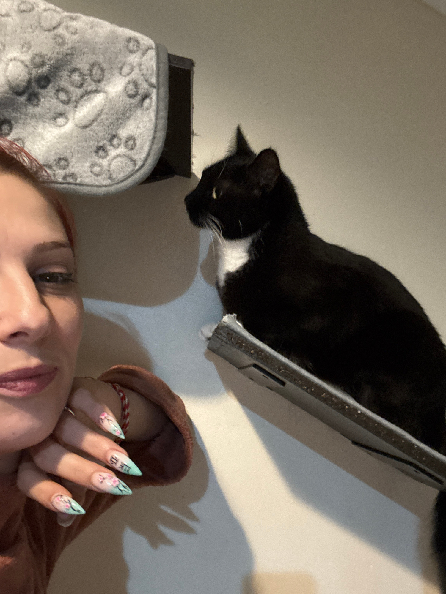 A selfie, taken indoors in Desborough, United Kingdom, captures a woman with red hair wearing a brown hoodie, her face close to the camera. She has pale skin, pink lips, and noticeable false nails, de…read more
