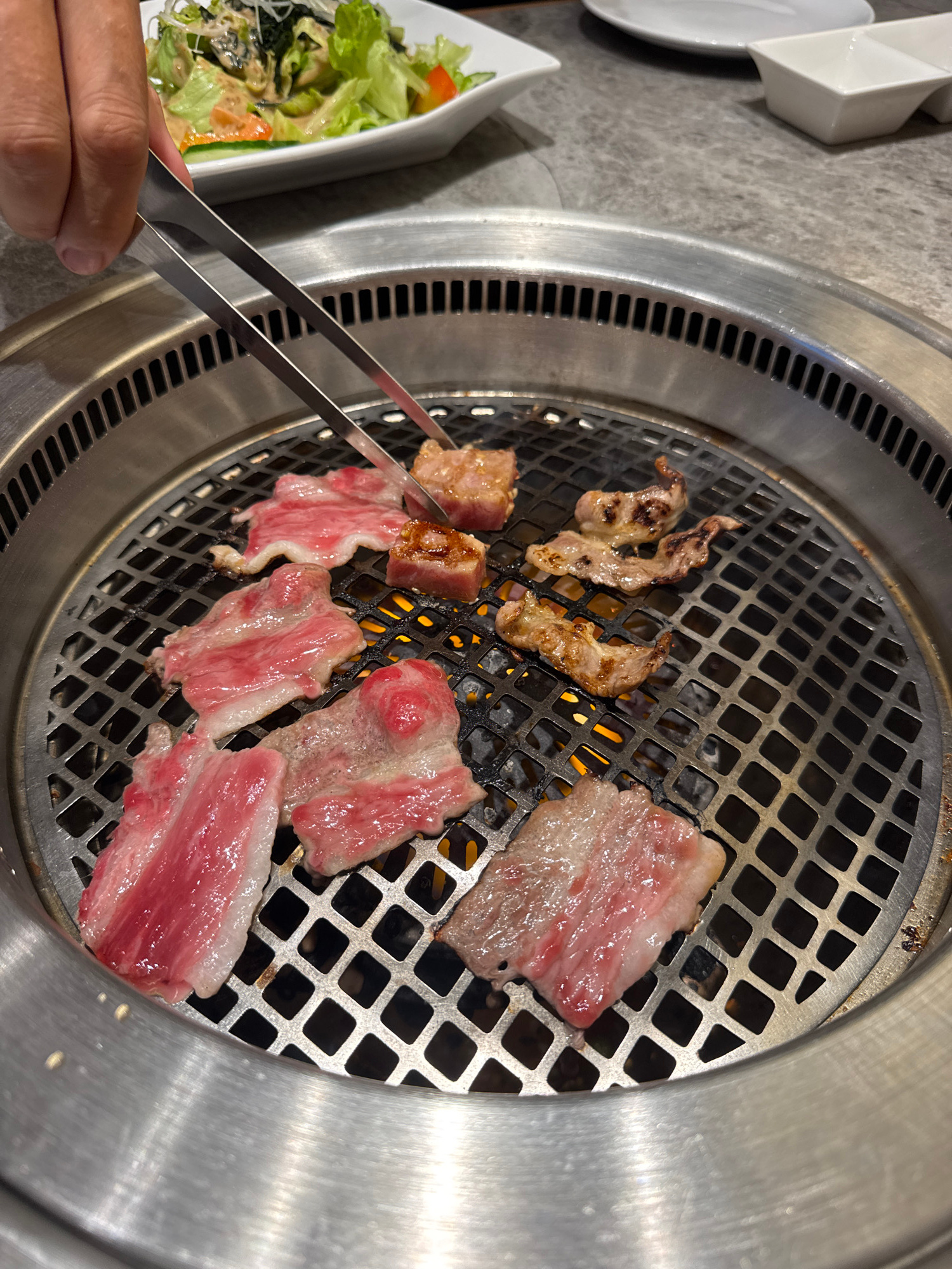 The image presents a close-up, overhead view of a tabletop BBQ grill in an indoor restaurant setting, located in Kuta Selatan, Indonesia. The main activity is grilling various cuts of meat. The centrβ¦read more
