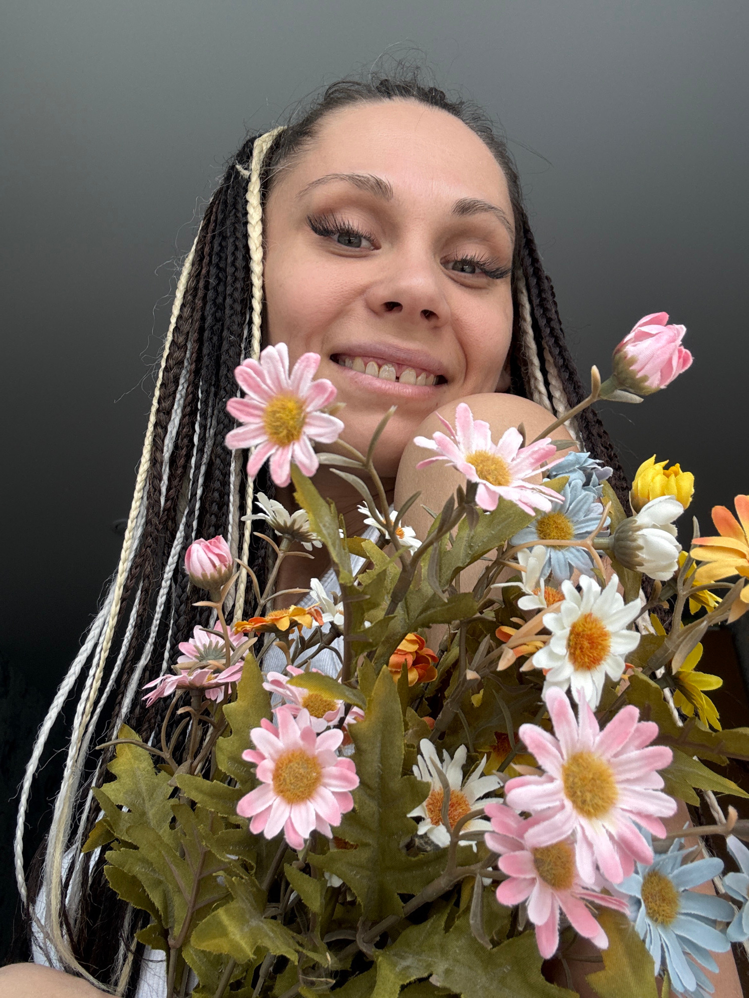 A woman with braided hair, colored brown, white, and black, is shown holding a large bouquet of artificial flowers in the foreground. The flowers are a mix of colors including pink, white, yellow, andβ¦read more