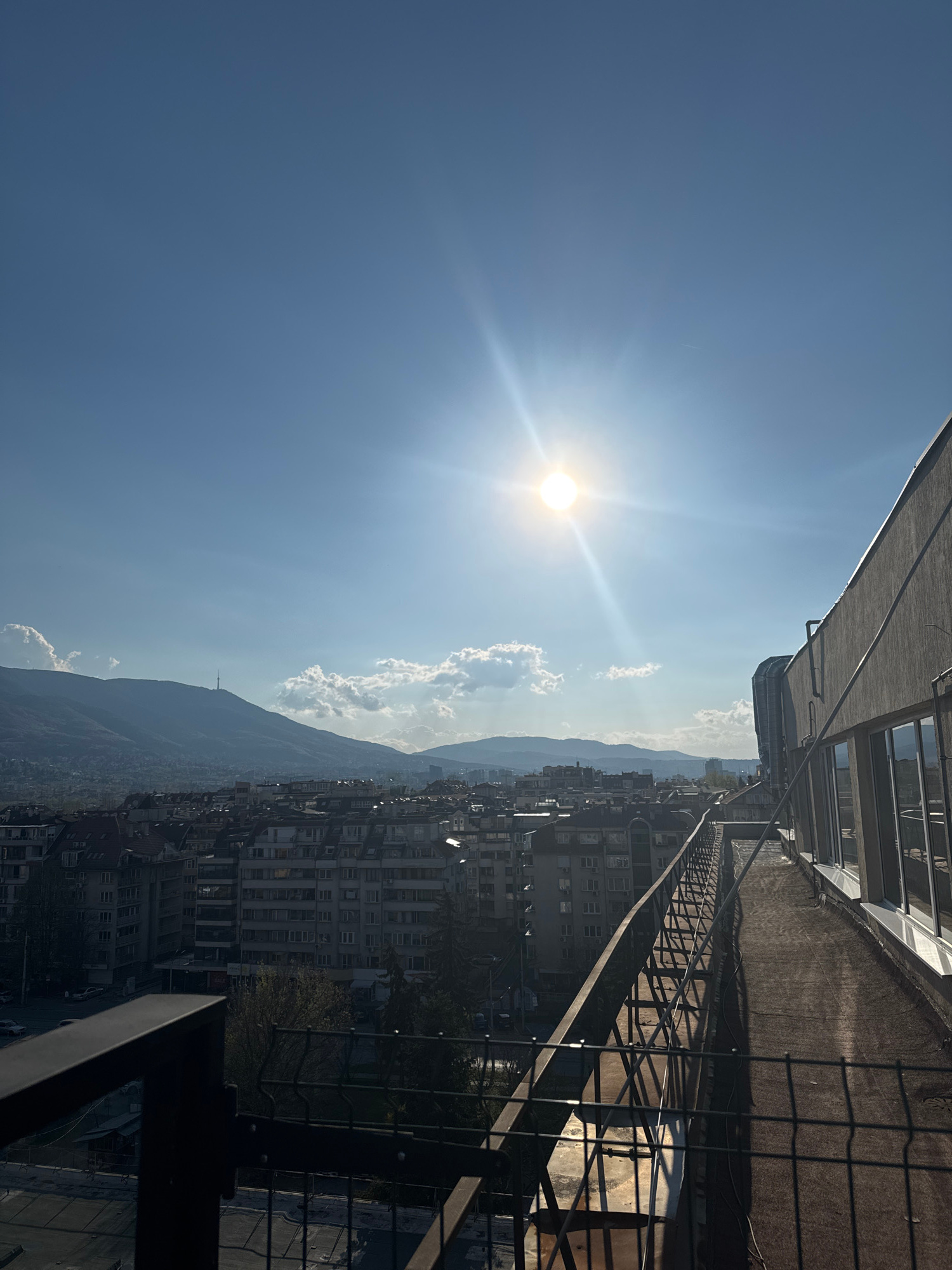 The image displays a panoramic view of a city nestled against a backdrop of mountains, under a bright, sunny sky. The photograph is taken from a high vantage point, likely a building's rooftop, lookin…read more