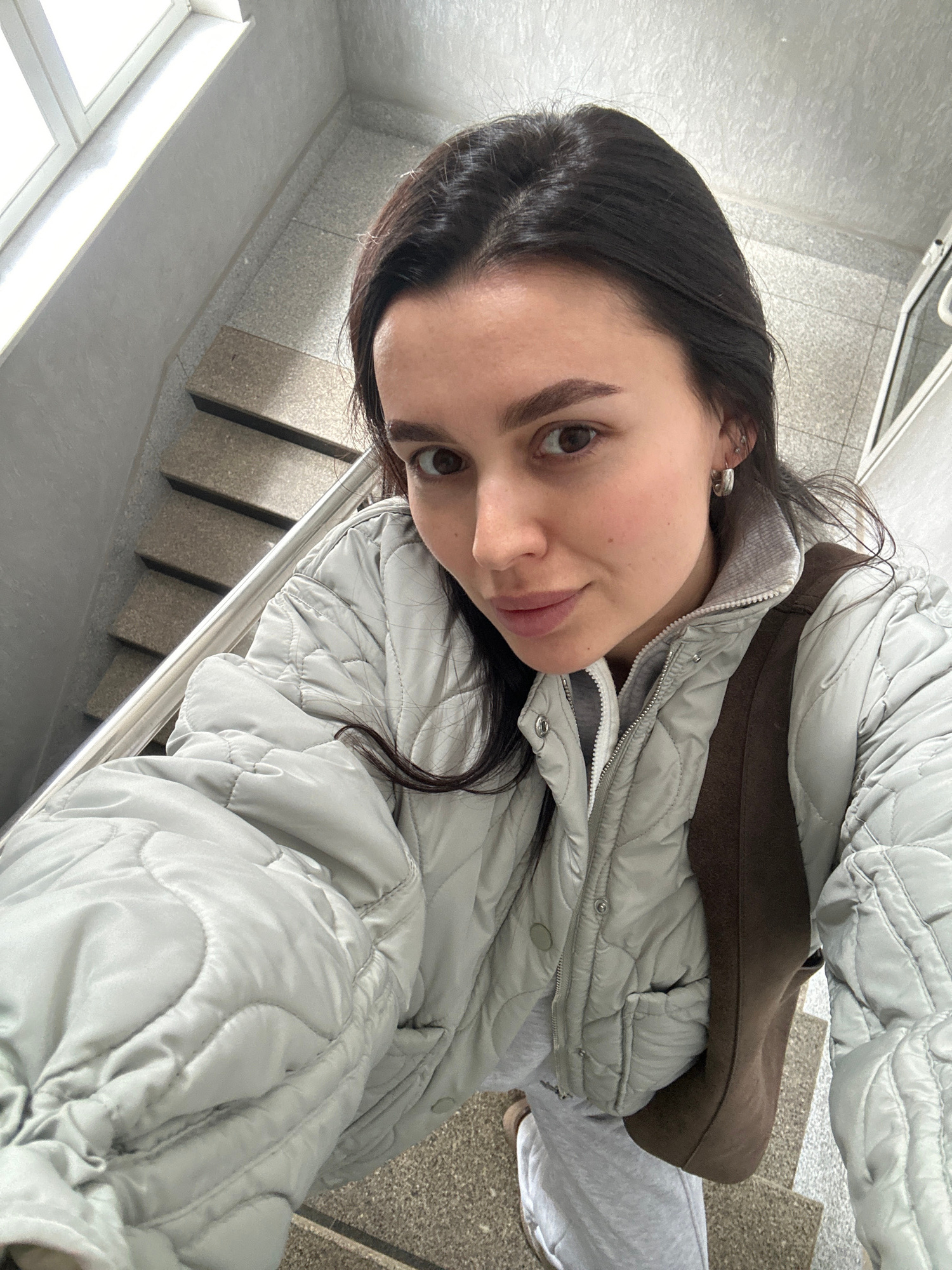 A young woman with dark hair is taking a selfie on a staircase. She is wearing a light grey puffer jacket and a brown bag is slung over her shoulder. The staircase appears to be indoors, with grey sto…read more