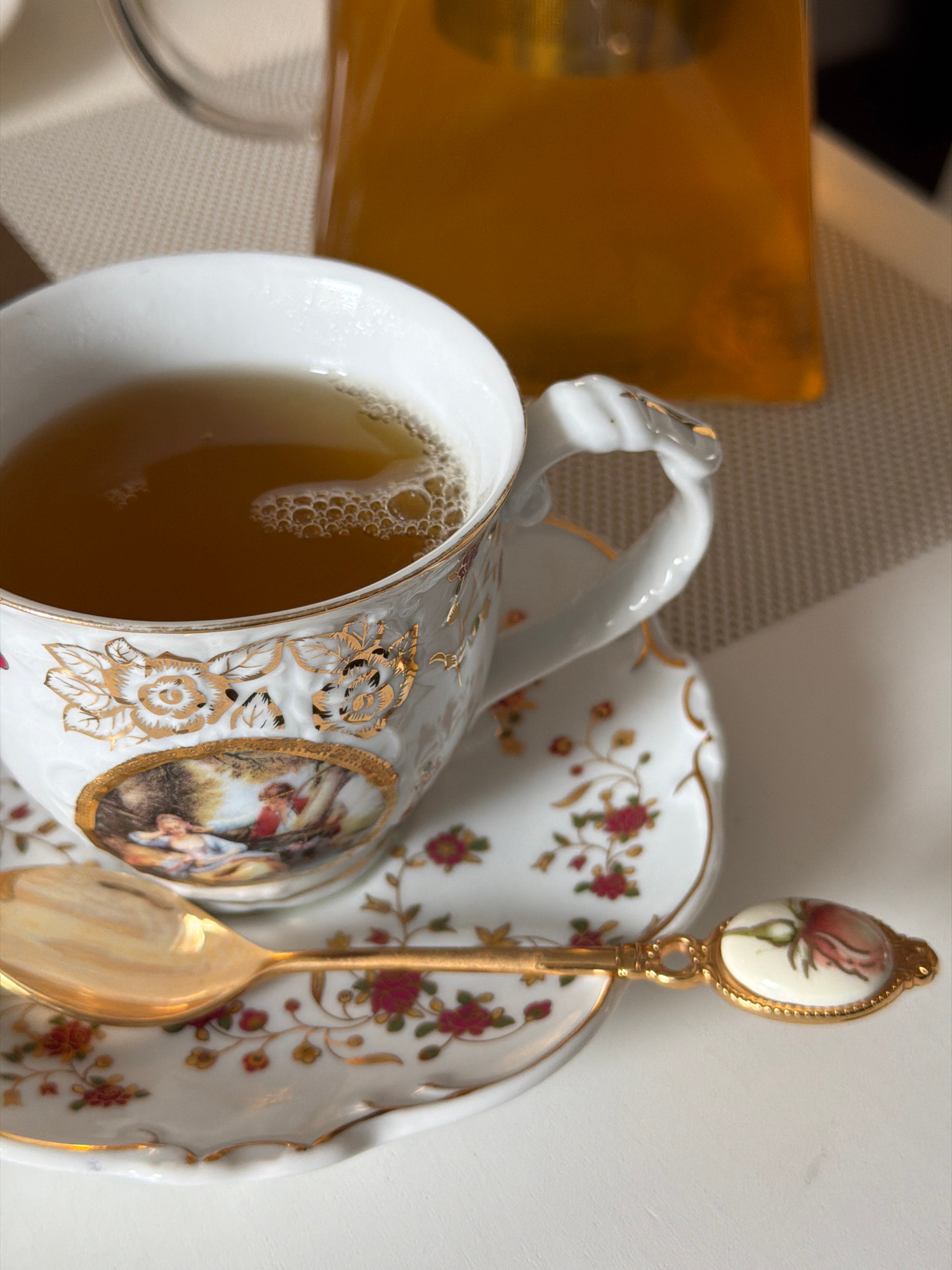 An elegantly decorated porcelain teacup, filled with a light amber-colored beverage, is positioned on a matching saucer. The teacup and saucer are made of white porcelain, extensively adorned with int…read more