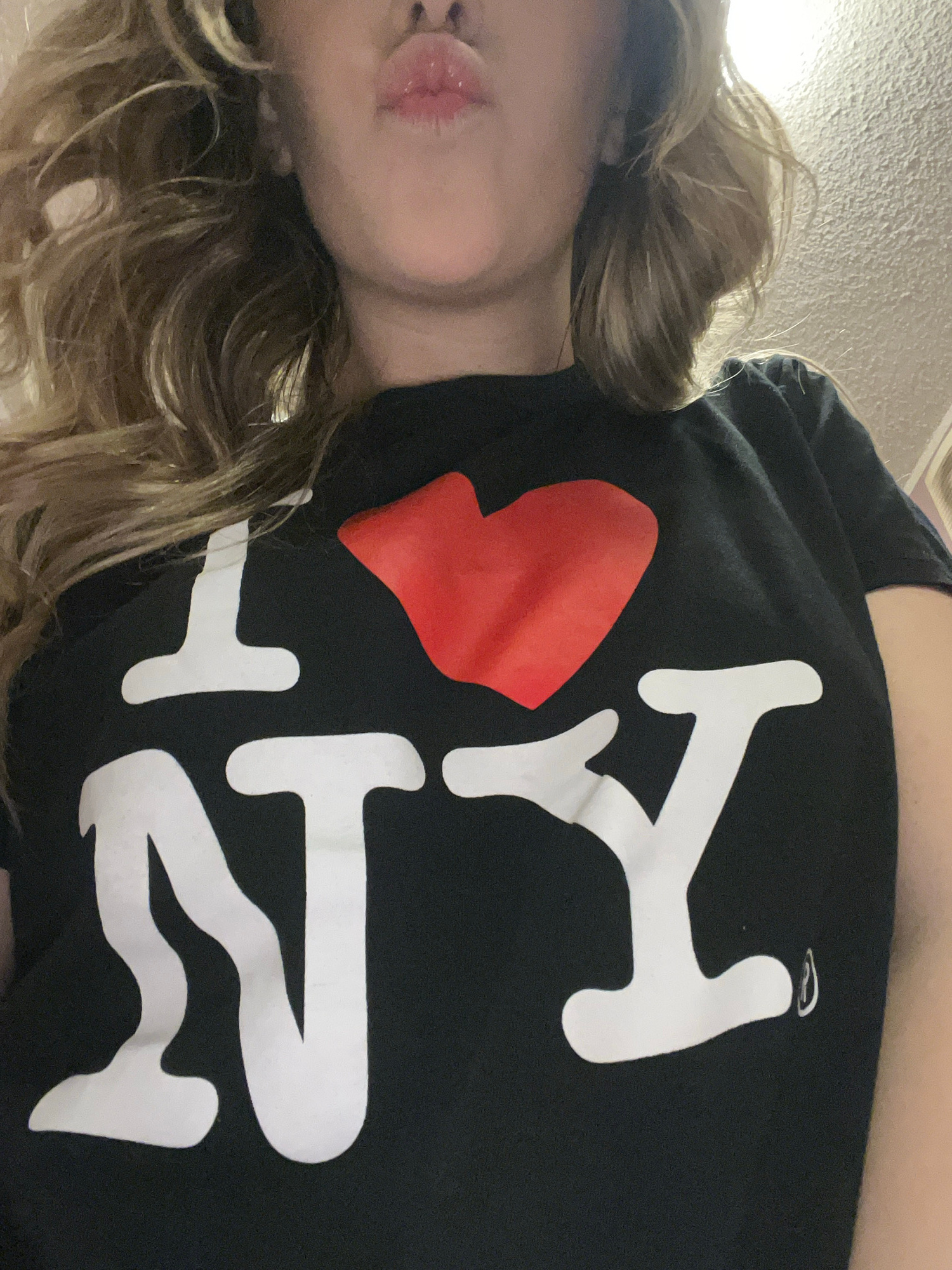 A person with blonde hair, shown from the chest up, is wearing a black shirt with the "I <3 NY" logo on it. The heart is red and the letters are white. The person is making a kissing face. The image i…read more