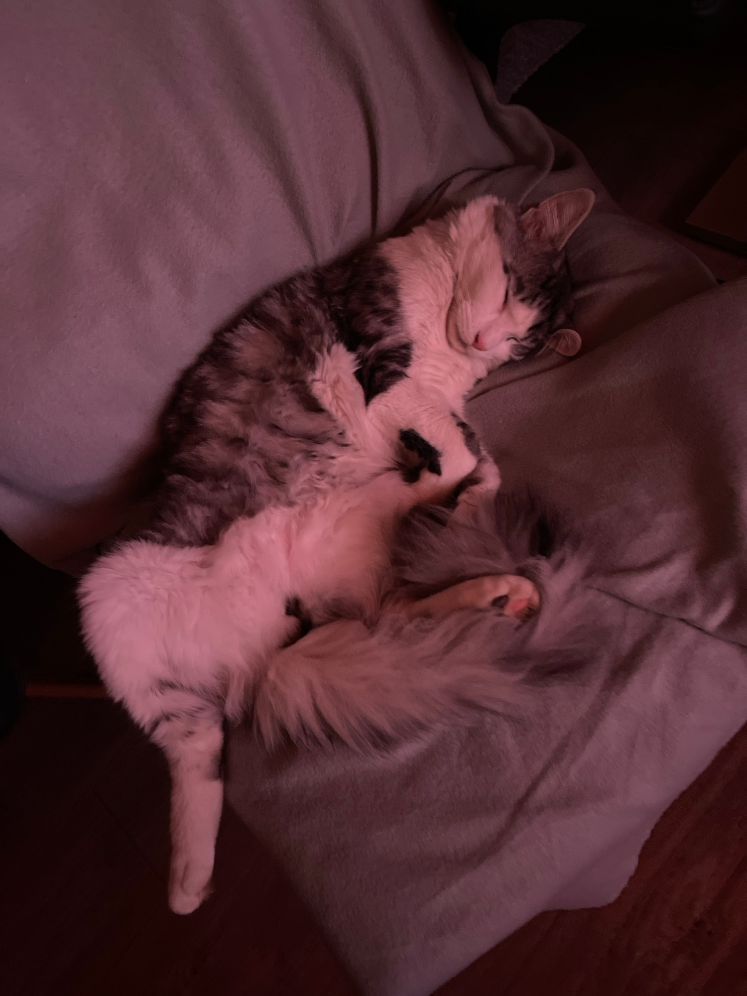 A cat with grey and white fur is lying on its back on a light grey blanket. The cat is positioned diagonally in the frame, with its head at the upper left and its hind paws at the lower right. Its eye…read more