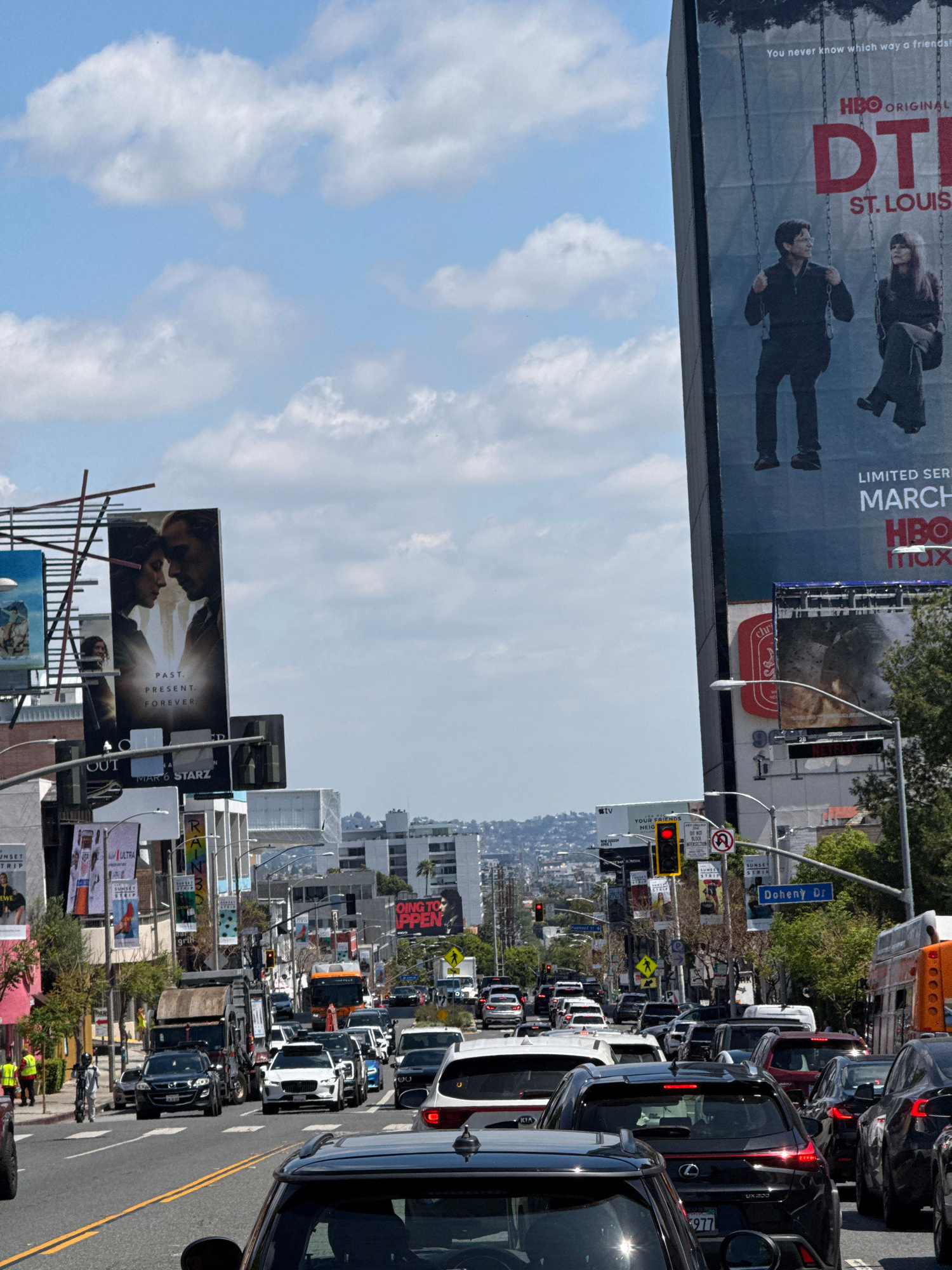 The image shows traffic congestion on a city street with numerous billboards on display. The billboards advertise various shows and movies. Street signs indicate the location is at the intersection of…read more