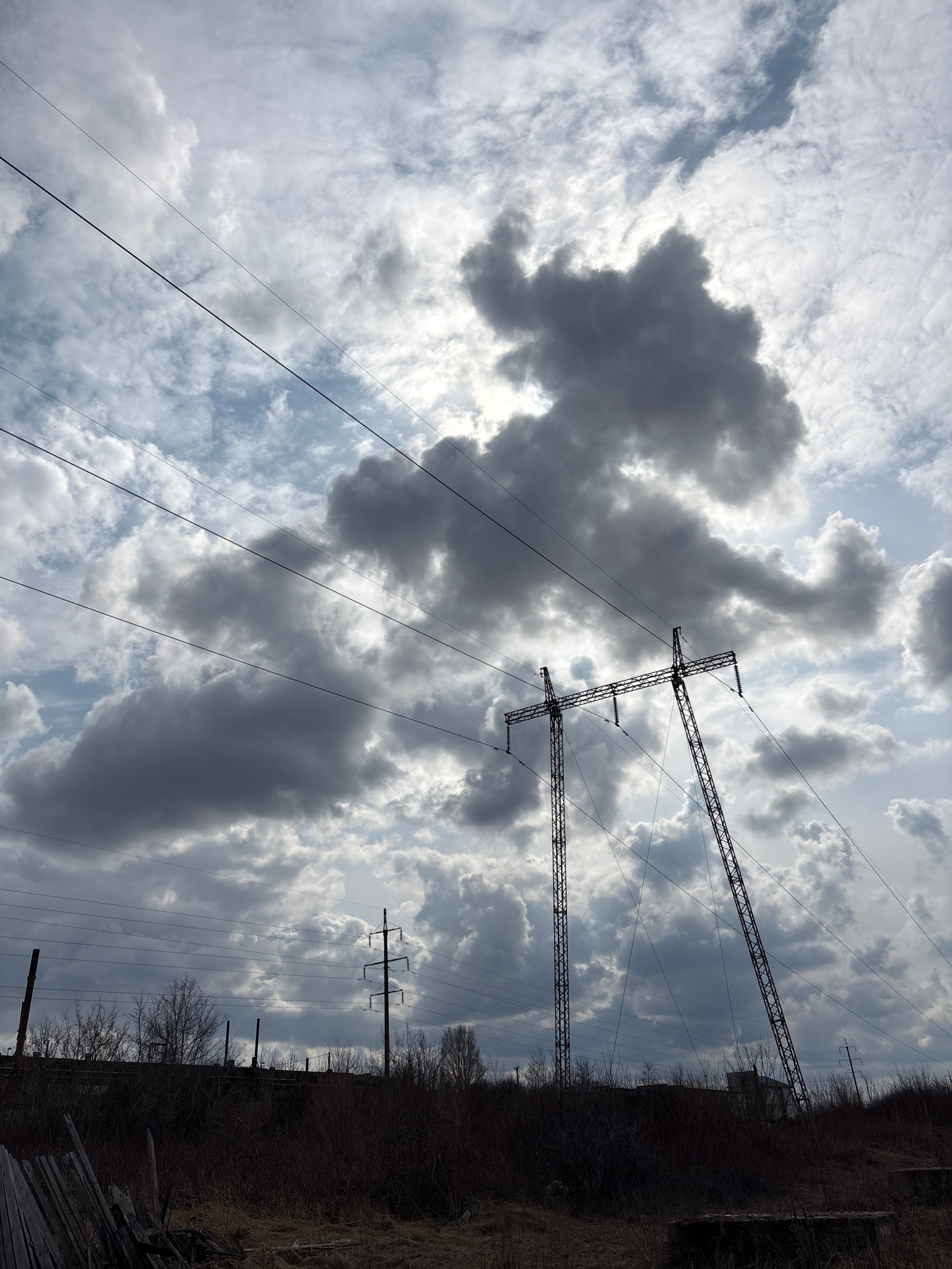 The image shows a view upwards towards the sky. Overcast with clouds, and a break in the clouds revealing blue sky. Power lines and power line towers are present. On the right side of the frame is an…read more