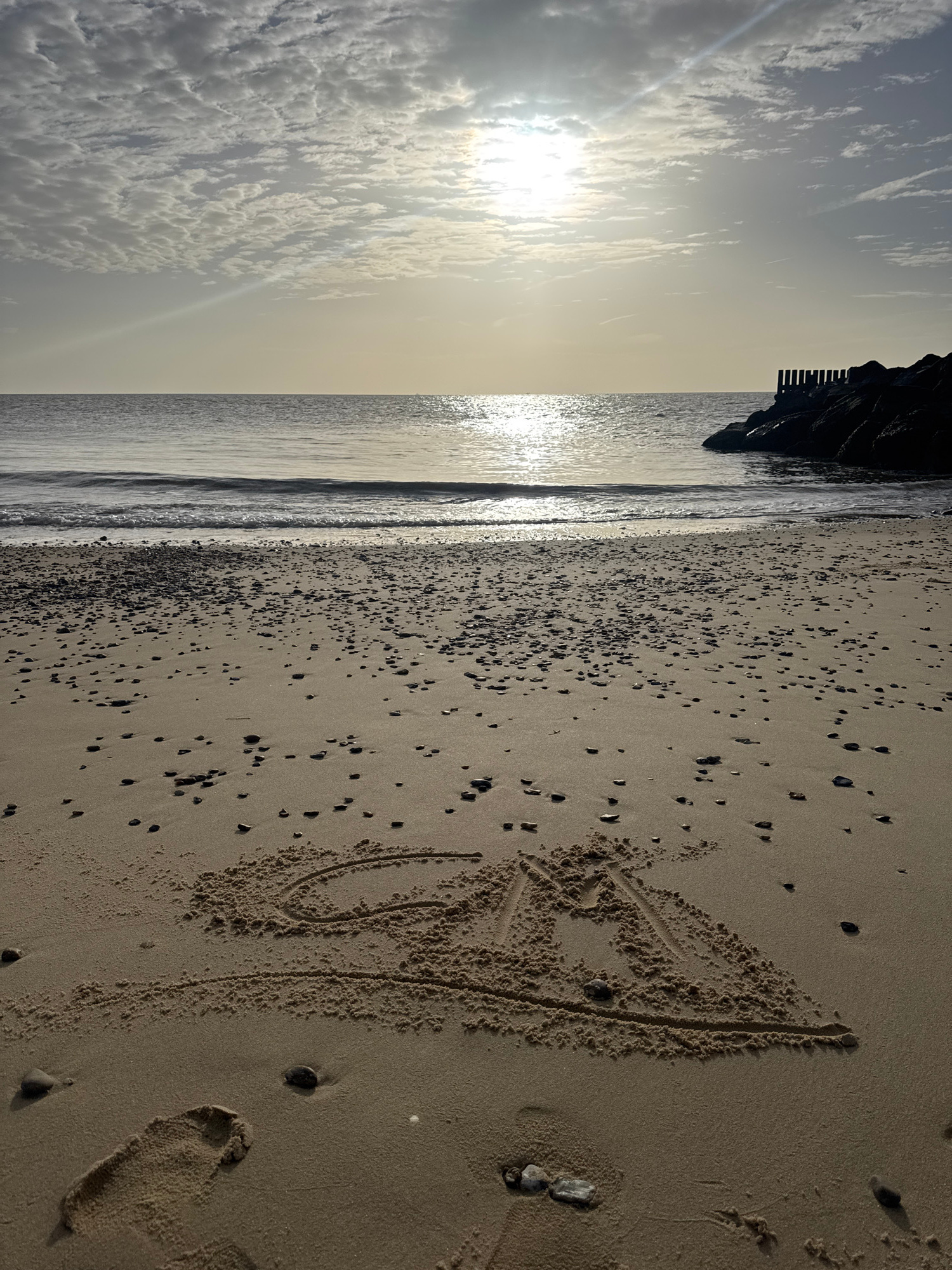 The image depicts a beach scene in East Suffolk, United Kingdom. The sky is overcast with the sun obscured by clouds. The sea is calm with small waves reaching the shore. A dark, possibly rocky, struc…read more