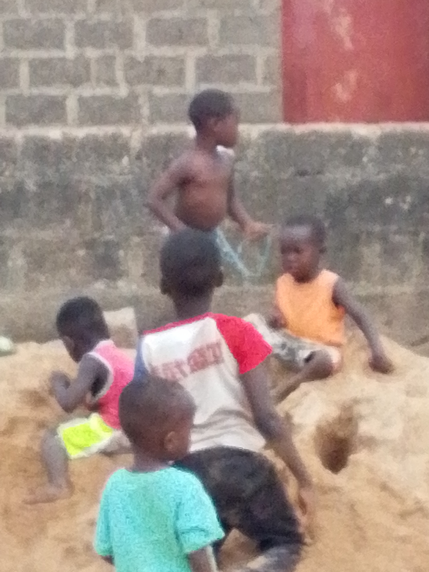 A group of five children are playing on a sandy surface in an urban environment of Unknown, Unknown. Three of the children are closer to the foreground, with the child nearest to the viewer wearing a…read more