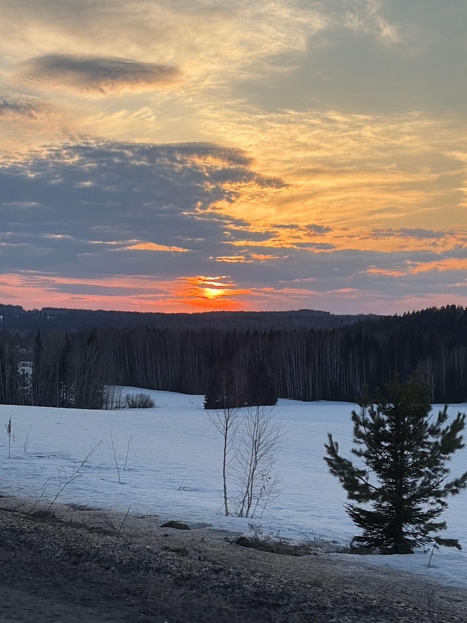 A landscape scene depicts a sunset over a snow-covered area, possibly a field or body of water. The sky is filled with clouds, showing a color gradient from orange to grey. A dark treeline sits betwee…read more