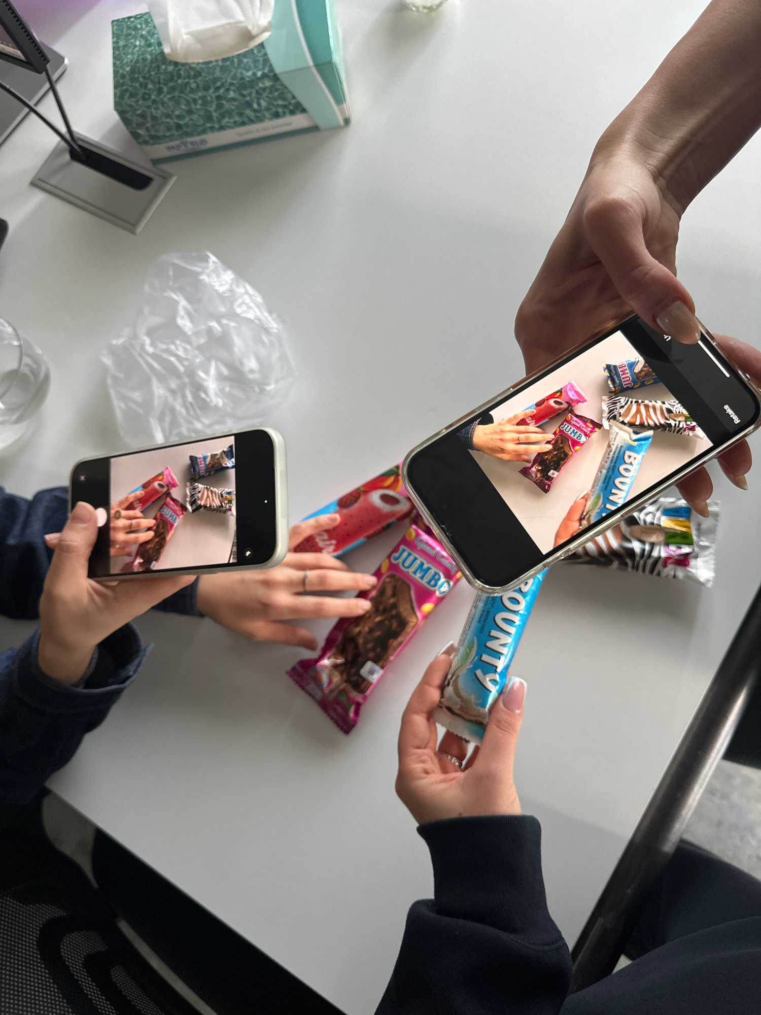 A high-angle shot depicts two individuals using their smartphones to photograph a collection of chocolate bars on a white surface. The subjects include a Bounty bar (blue wrapper), several Jumbo choco…read more