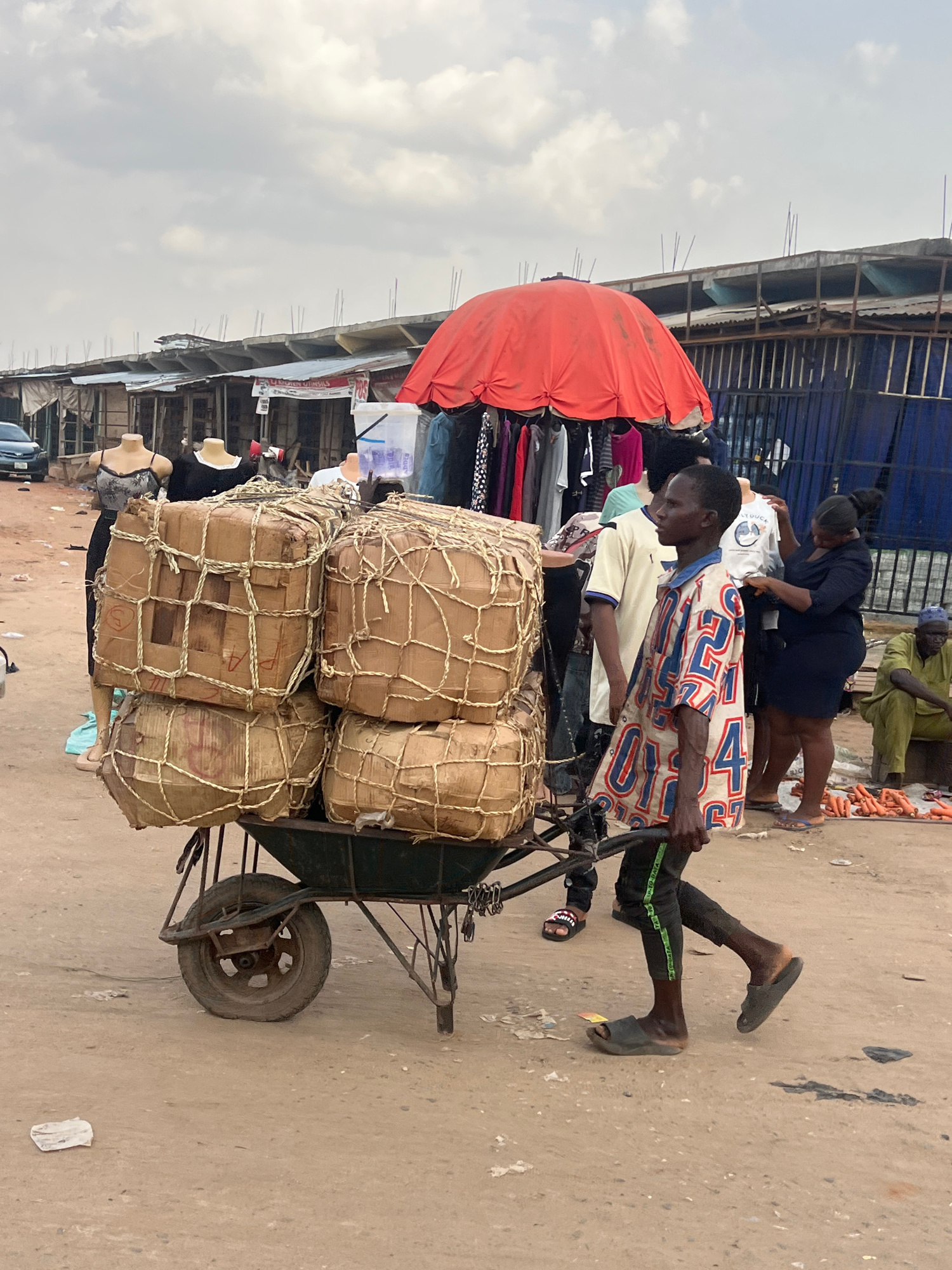 In Oko Amakom, Nigeria, a man wearing a patterned shirt and dark pants pushes a heavily laden two-wheeled cart along a concrete surface. The cart is stacked with six large, rectangular packages, eachβ¦read more