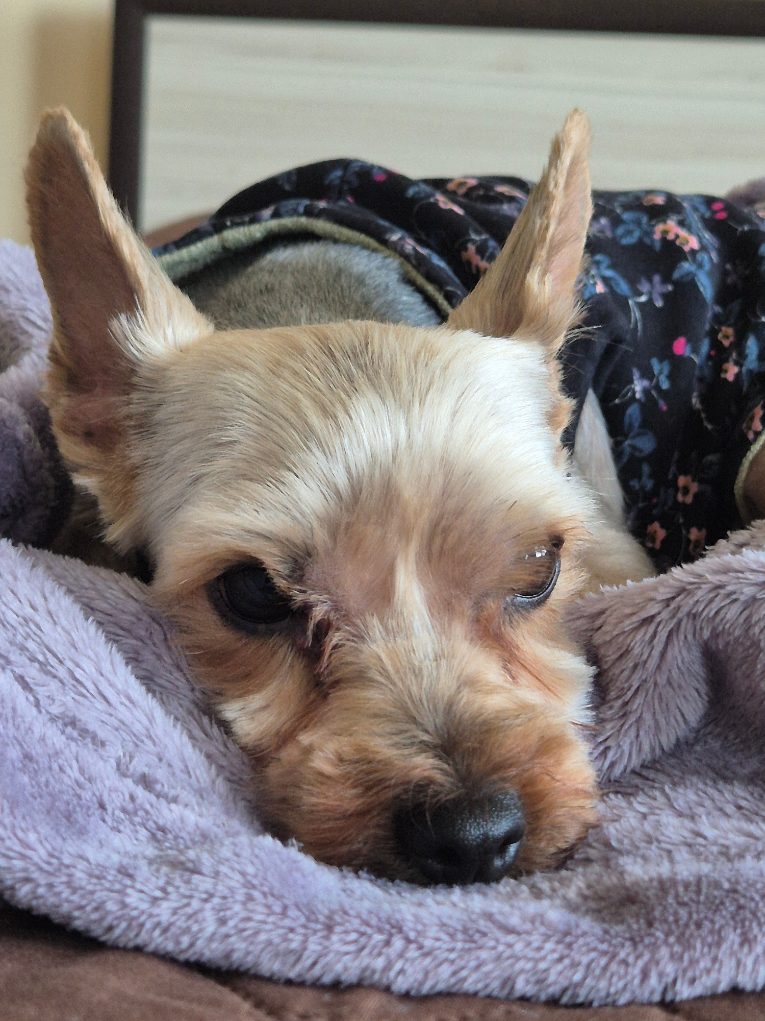 A small dog, likely a terrier breed, is captured in a close-up, vertical shot, appearing comfortably nestled. The dog has predominantly light brown and blonde fur, with a visible dark, round eye and a…read more