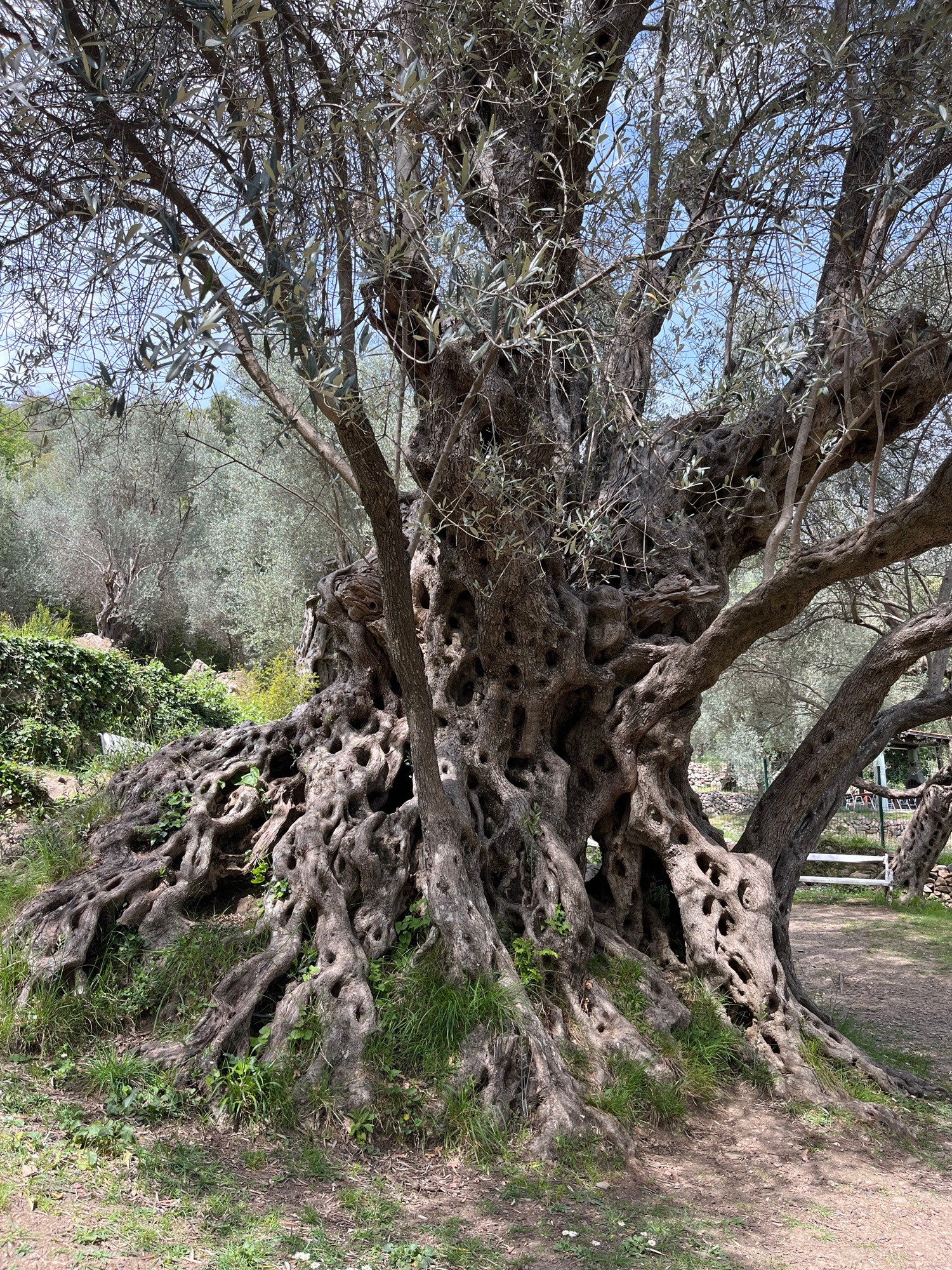 The image displays an ancient and massive olive tree, dominating the foreground with its extraordinarily gnarled, twisted, and weathered trunk. The tree's base and lower branches are heavily convolute…read more