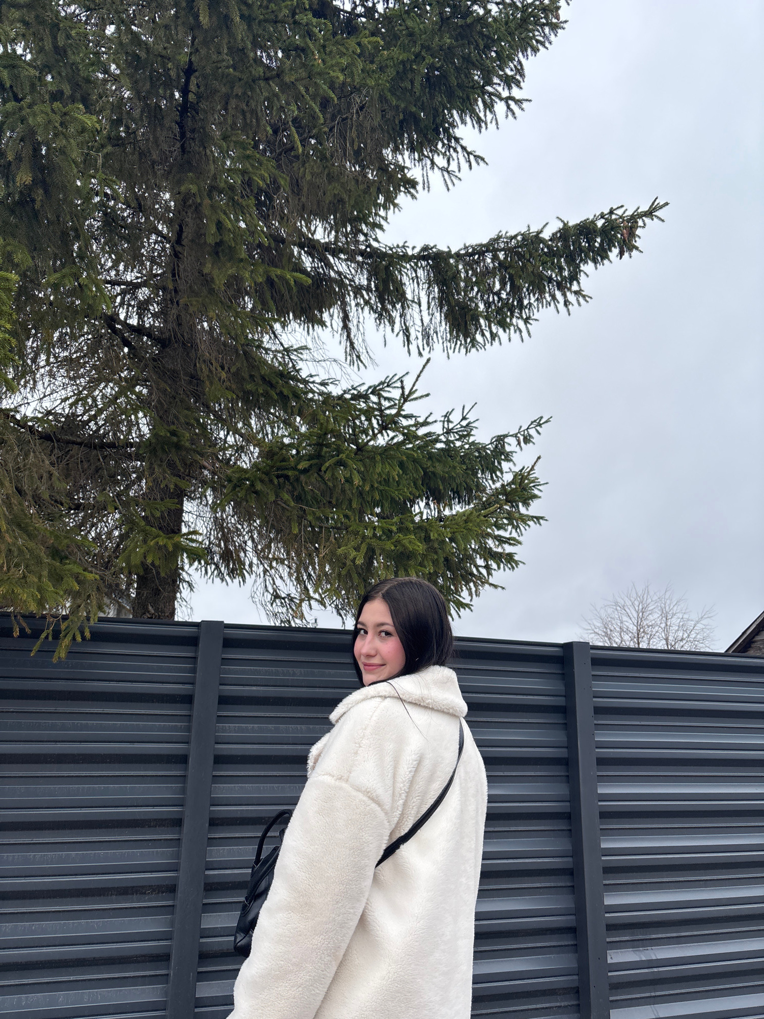 A low-angle shot shows a dark-haired woman wearing a white, fluffy coat standing adjacent to a grey metal building with vertical lines. Part of a tree with green foliage is visible to the left, with a…read more