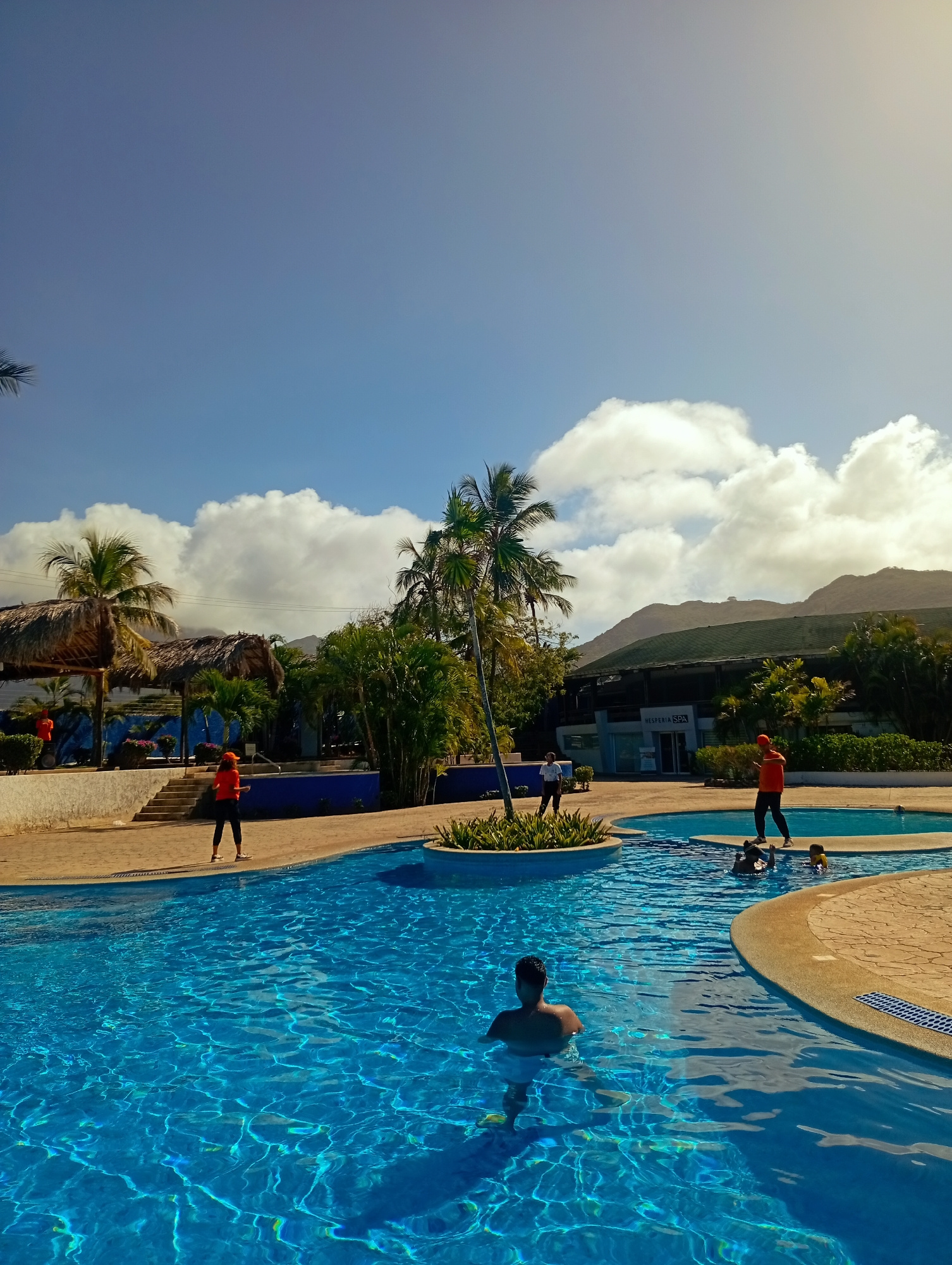 The image depicts a sunny day at a pool complex in Playa El Agua, Venezuela. The complex has multiple interconnected pools with bright blue water. Several people are visible in and around the pools. O…read more