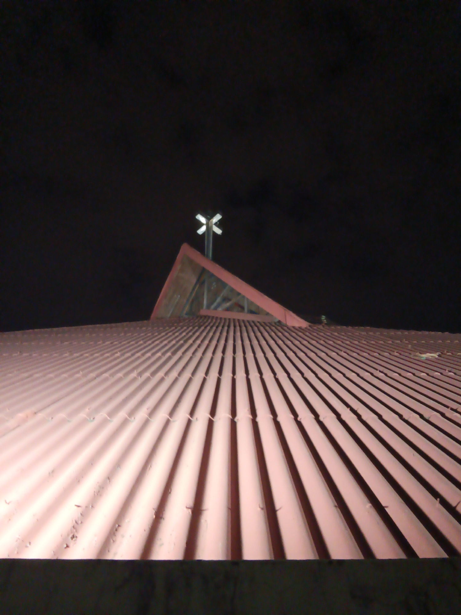 The image shows a corrugated metal roof in Guayaquil, Ecuador, at night. Atop the roof is a triangular structure with a white cross-shaped light fixture. The sky is dark. There are no people visible.