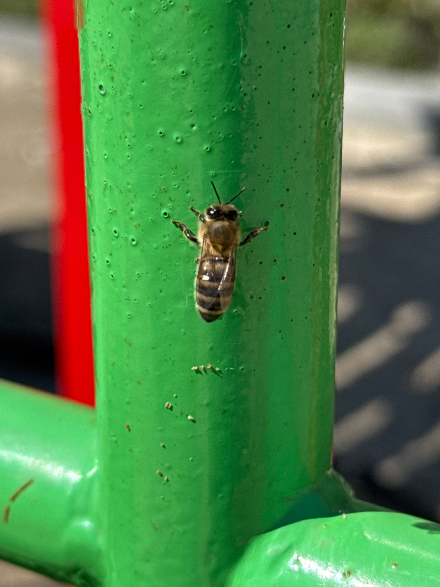 A bee rests on a green metal bar with red accents, possibly part of a playground or public seating fixture. The background shows blurred elements of an urban environment, including indistinct shapes a…read more