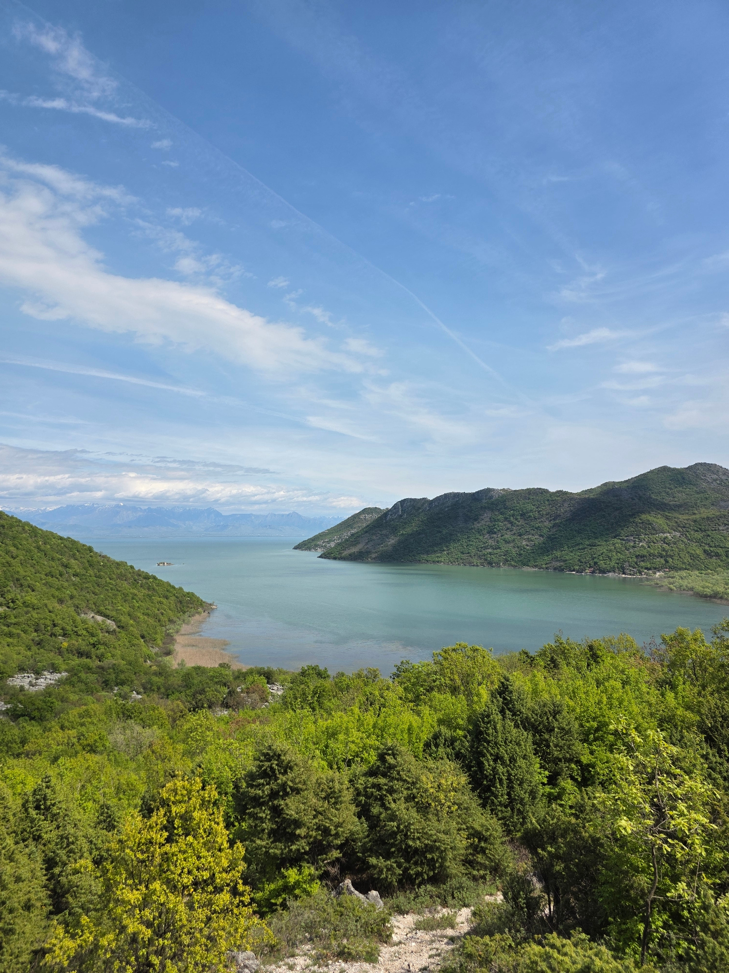 The image shows a view of Skadar Lake in Godinje, Montenegro. The lake is surrounded by green mountains and dense vegetation. The sky is light blue with streaks of clouds. In the distance, mountains a…read more