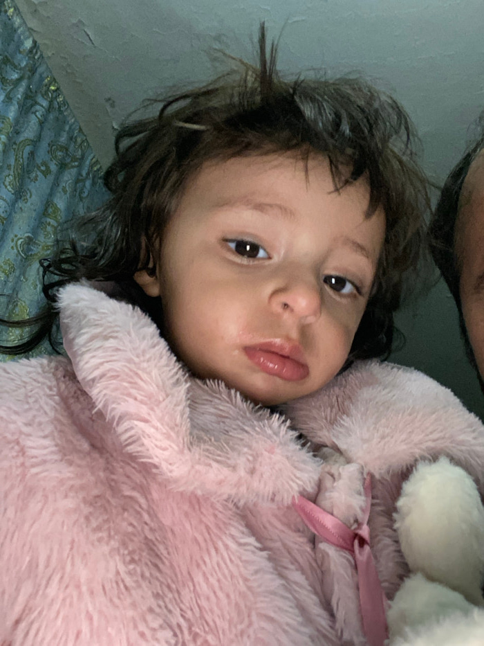 A young child with brown hair and eyes rests on a paisley patterned surface. They are snuggled in a light pink, fluffy blanket or stuffed animal with a satin ribbon. The child's face is slightly damp,…read more