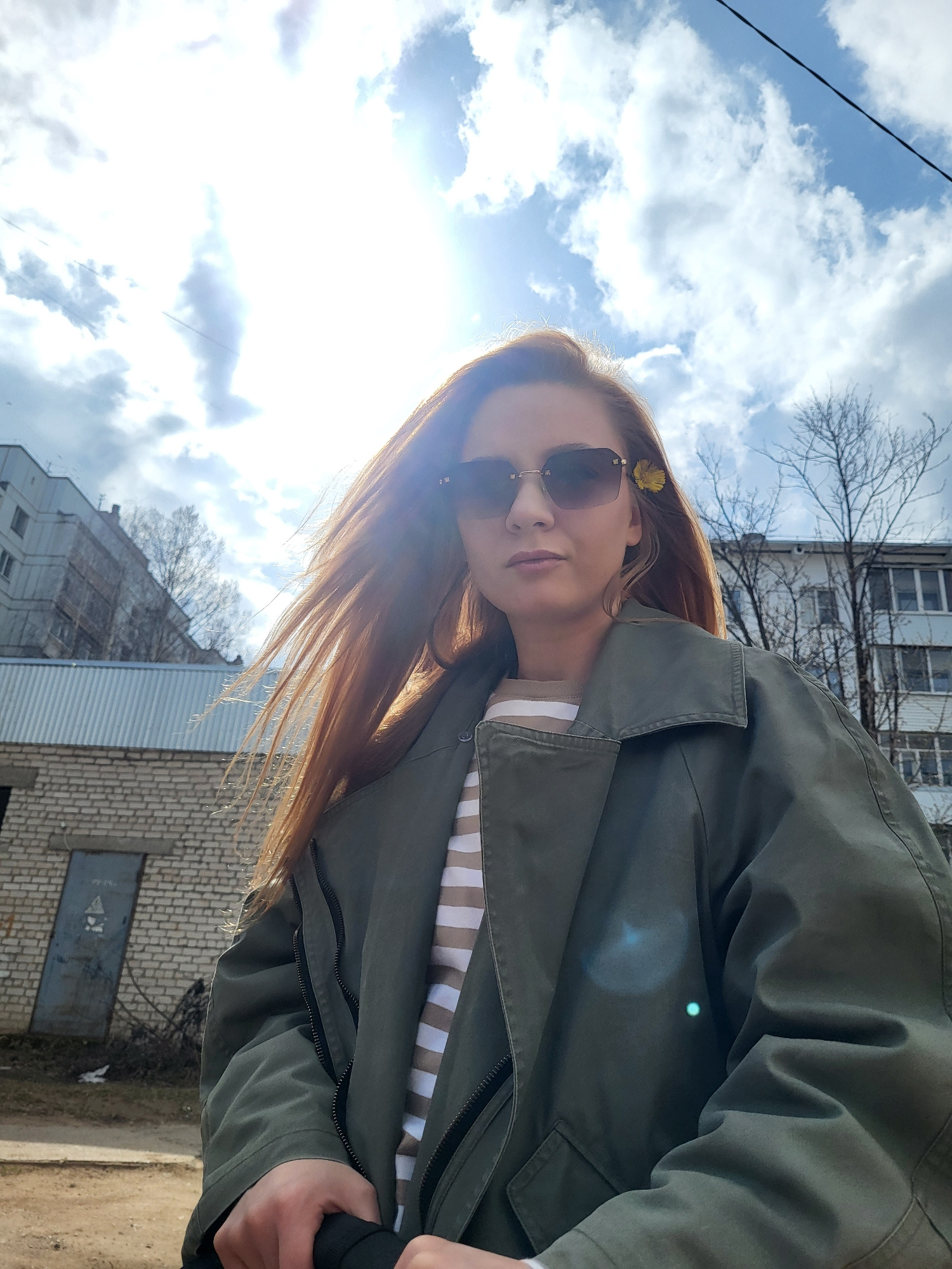 A woman is outdoors, seemingly in the city of Chaikovsky, Russia, based on architectural styles. She wears sunglasses, a green jacket, and has a yellow flower tucked behind her ear. Her hair is reddis…read more
