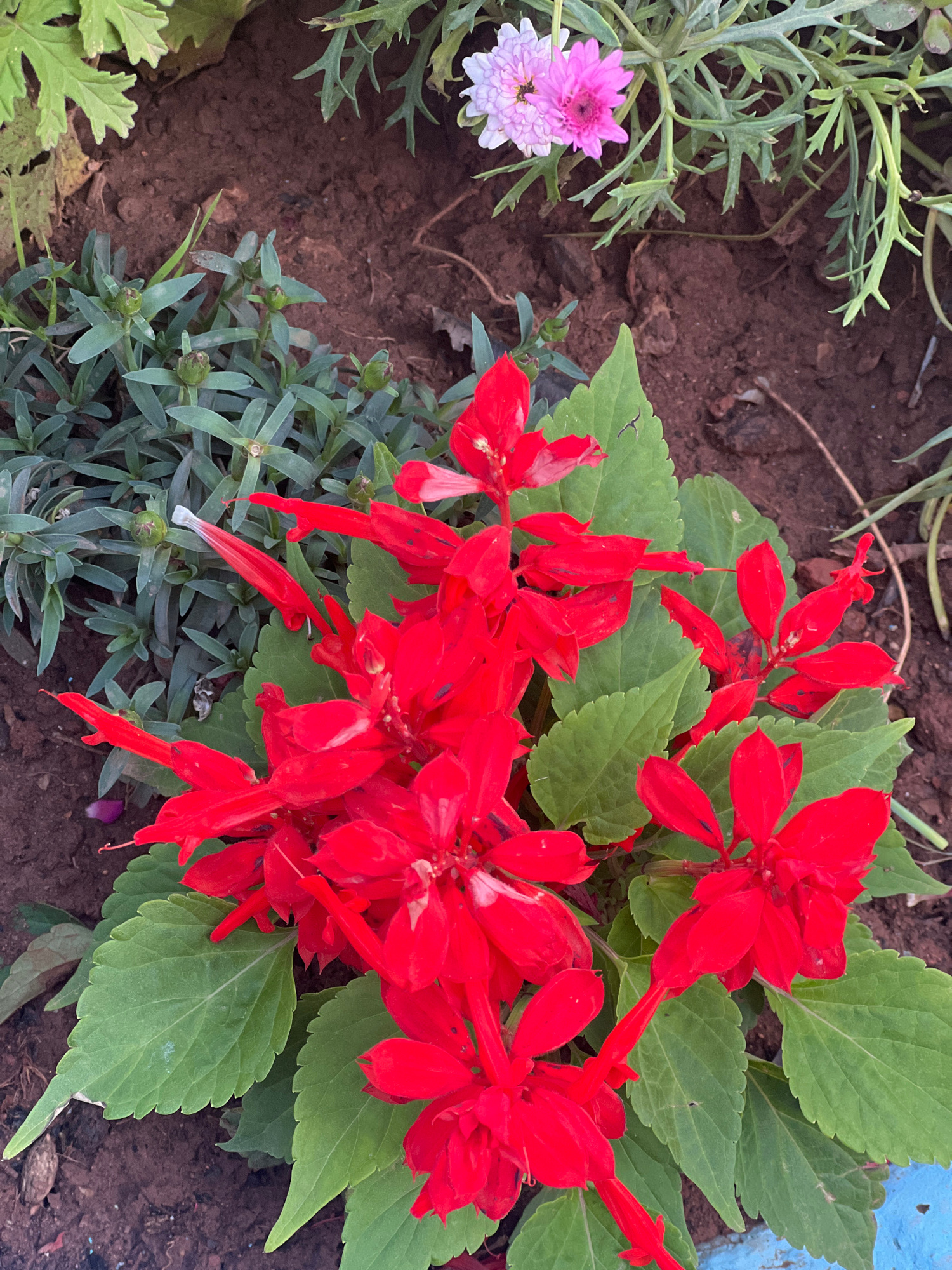 The image depicts a close-up shot of a cluster of bright red Salvia splendens flowers blooming in what appears to be a garden bed. The green foliage of the Salvia plant is also prominent. To the left…read more