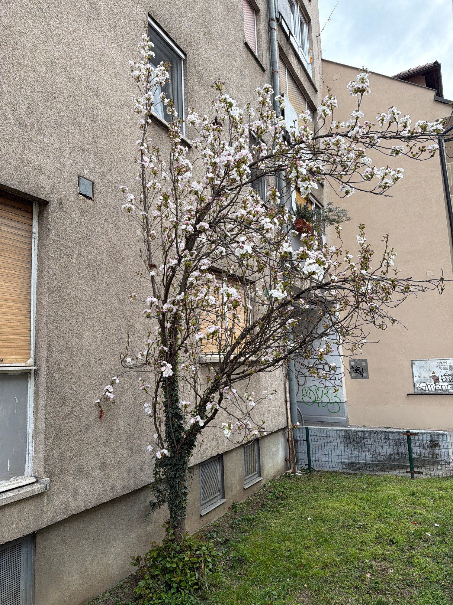 The image presents an urban scene, likely in Ljubljana, Slovenia, judging by the architectural style. A flowering tree, possibly a cherry blossom, is prominently featured in front of a multi-story bui…read more
