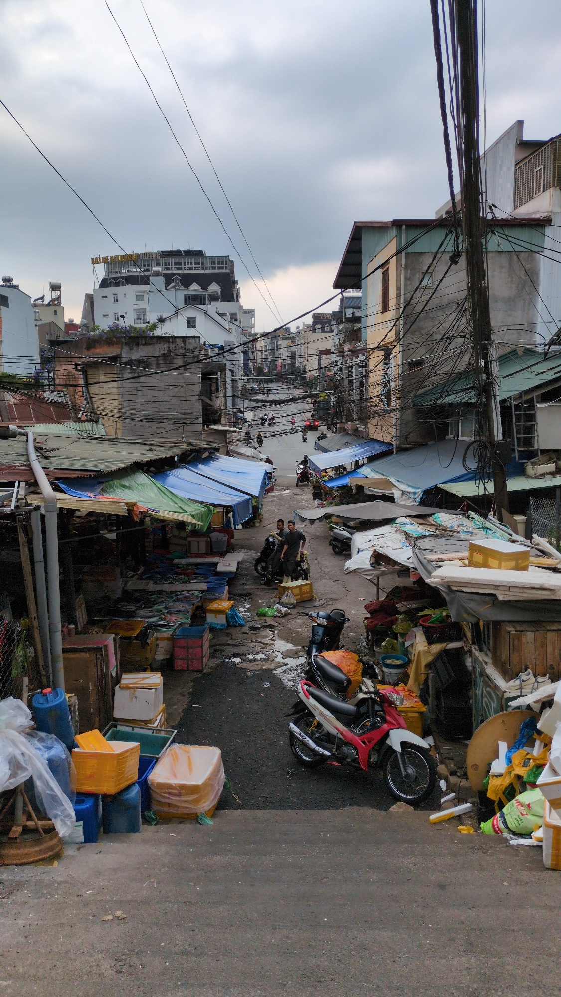The image depicts a narrow street in Da Lat, Vietnam, densely packed with shops and stalls. The street appears to be a local market area, with various goods for sale, including food and household item…read more