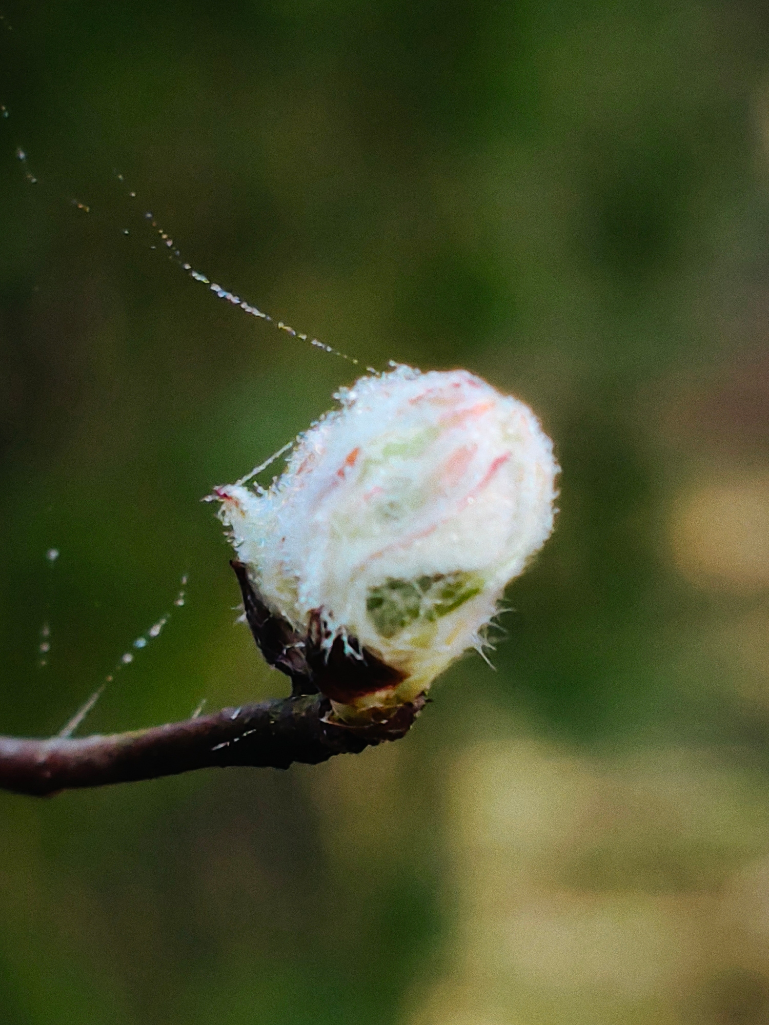 A close-up macro photograph captures a plant bud, likely an early spring blossom such as apple or cherry, in Kratovo, Russia. The bud is the central and sharpest subject, predominantly white and cover…read more