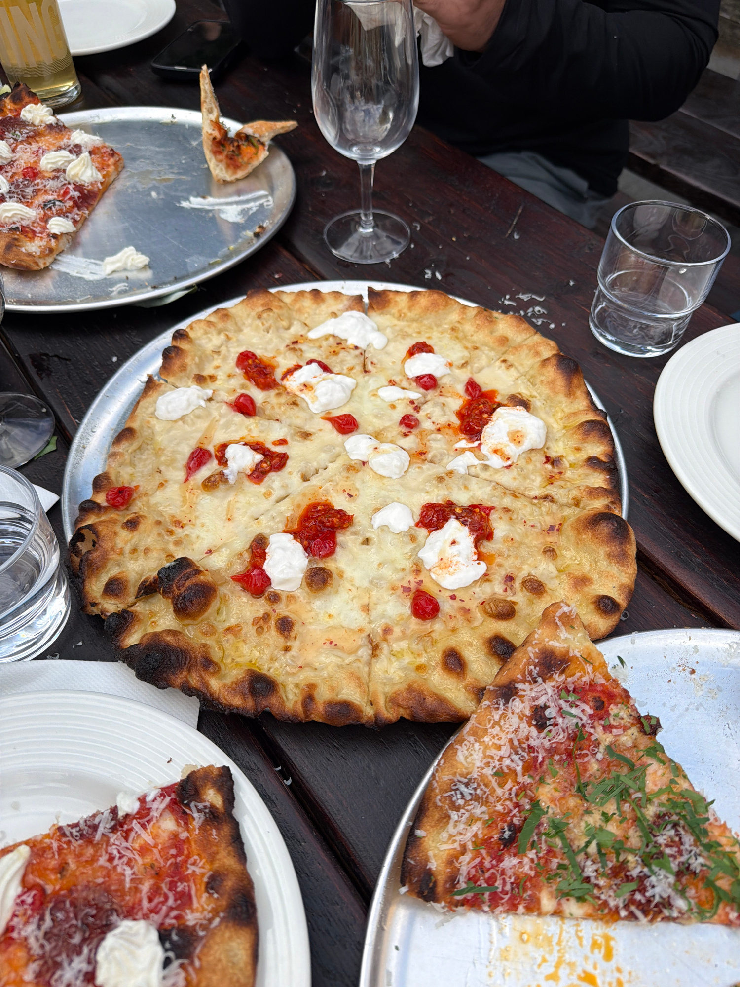 A high-angle shot displays a dark brown wooden table laden with food and drink. A whole round pizza, topped with dollops of white cheese and red sauce, sits on a silver metal plate in the center. To t…read more