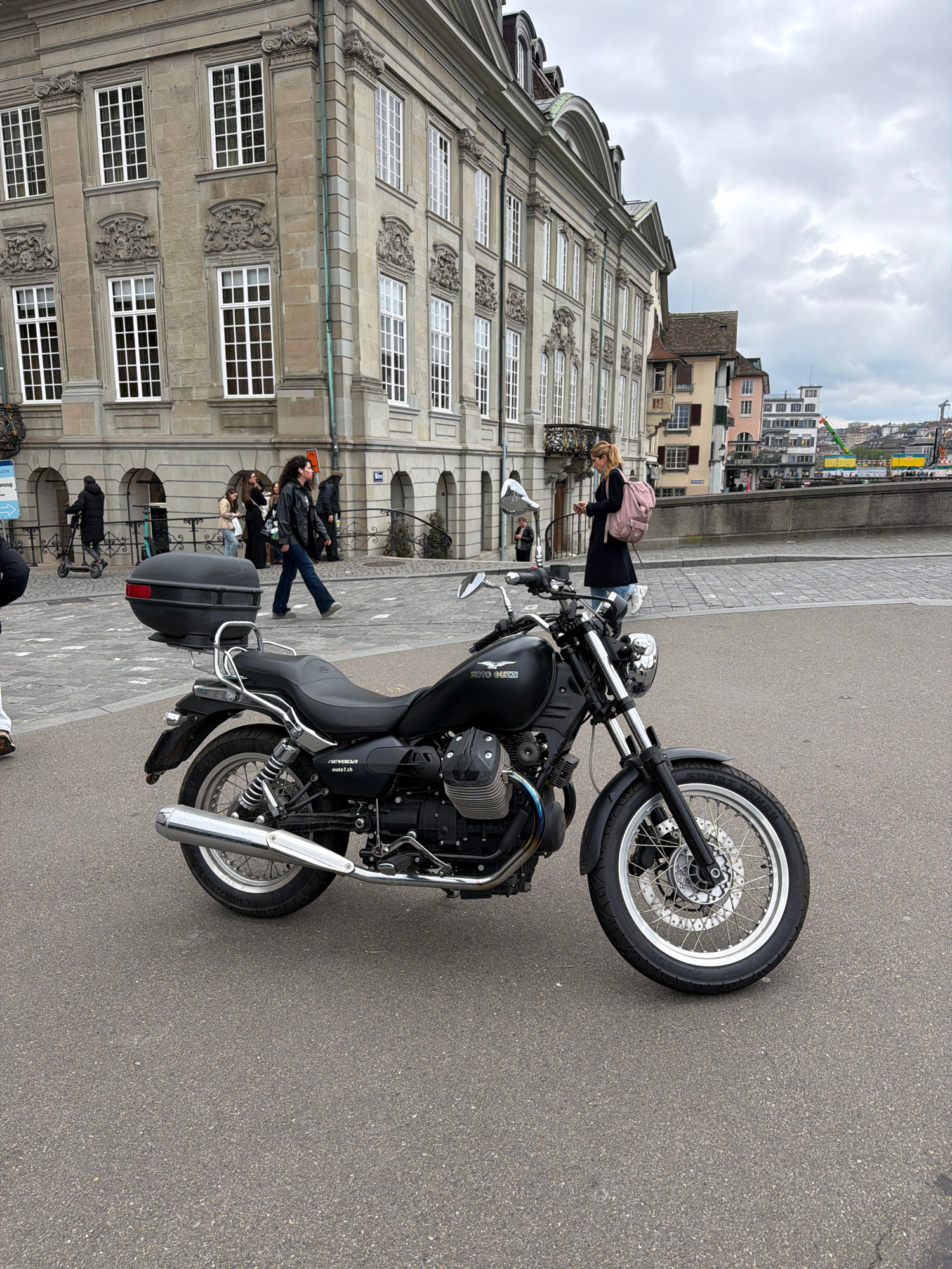 A black Moto Guzzi motorcycle is parked on a grey paved sidewalk in Zurich, Switzerland. The motorcycle is facing right. A woman with blonde hair and a pink backpack stands on a balcony of the buildin…read more