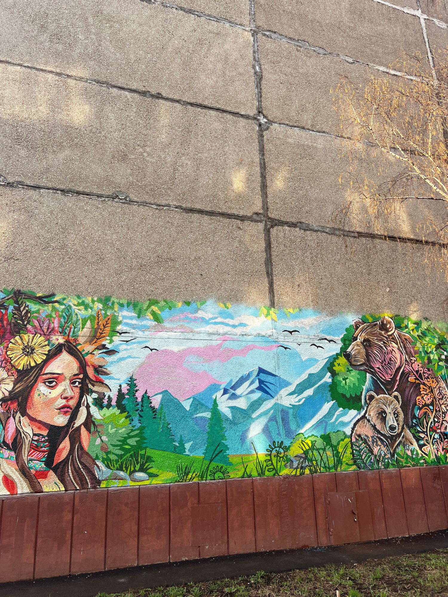 A high-angle shot captures a ground-level mural, likely in Ufa, Russia, blending nature and portraiture. A concrete sidewalk occupies the left half, transitioning into the mural on the right. The mura…read more
