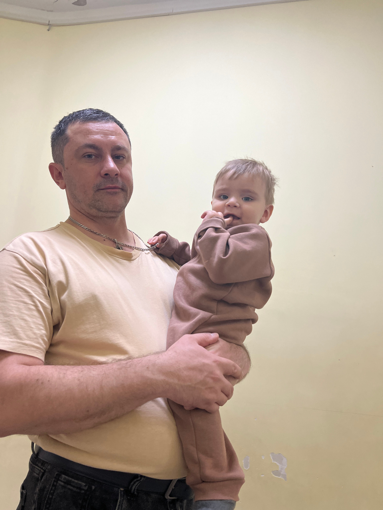 A man is holding a young child, approximately 1-2 years old, on his shoulders. The man is fair-skinned with short, graying hair and is wearing a light beige t-shirt and dark jeans with a belt. He has…read more
