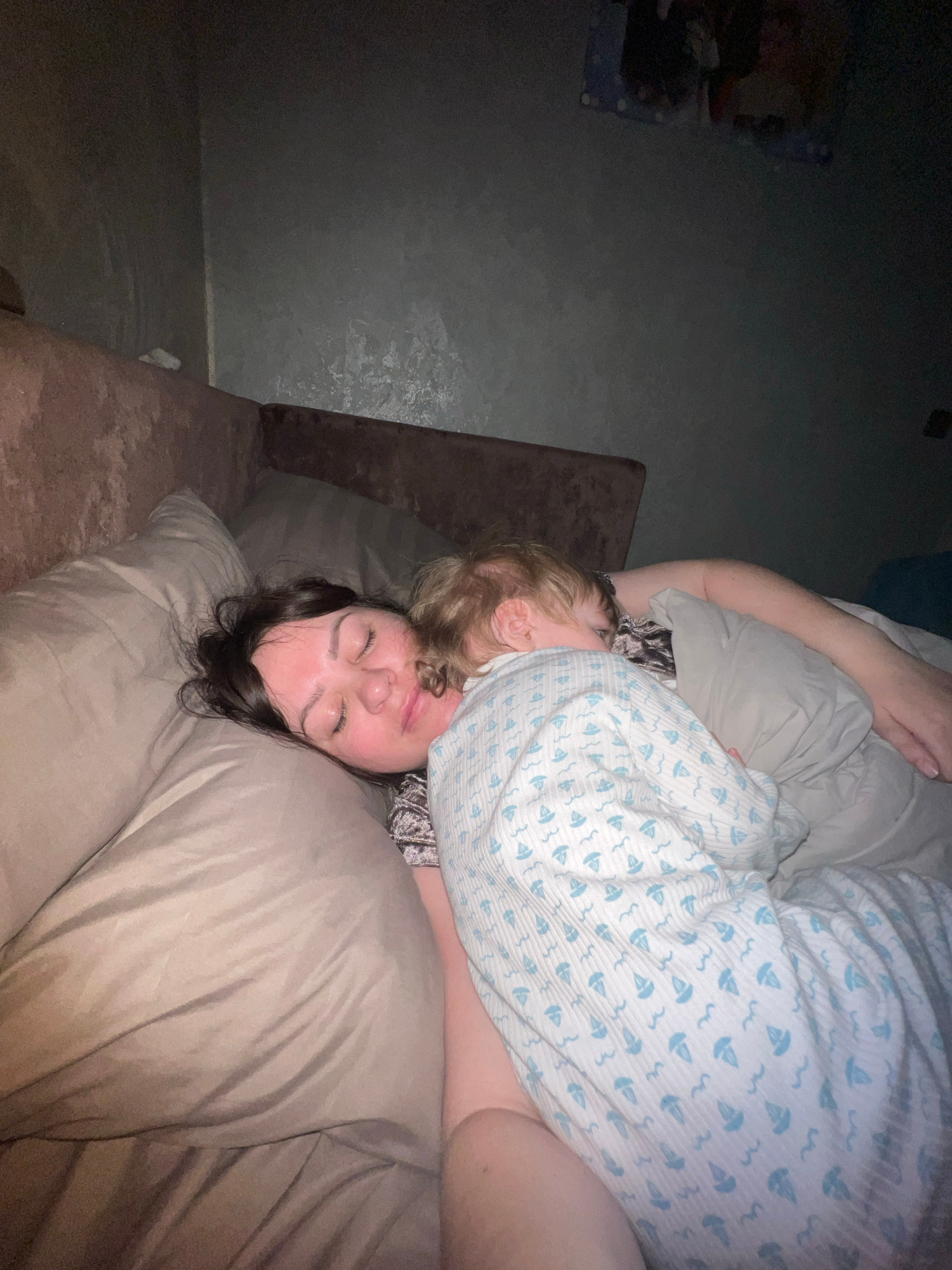 A photograph depicts an adult woman lying on a bed, with a small child lying on top of her. The woman is lying on a beige pillow with her eyes closed. The child is partially covered by a white blanket…read more