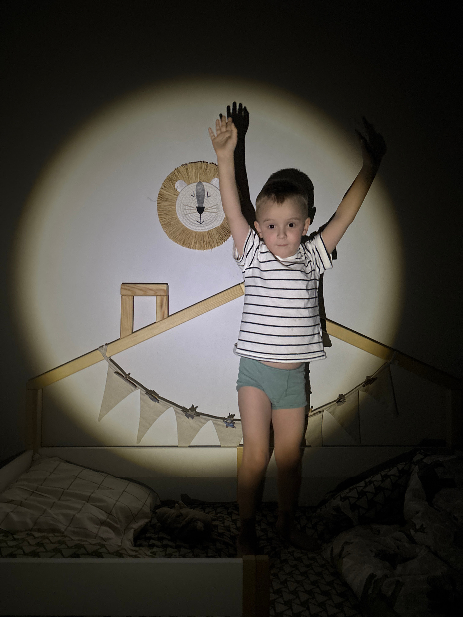 A young boy lies on his back under the spotlight. He is wearing a striped short-sleeved shirt and green shorts. His arms are extended to either side of his body. Above him is the wooden frame of a pla…read more