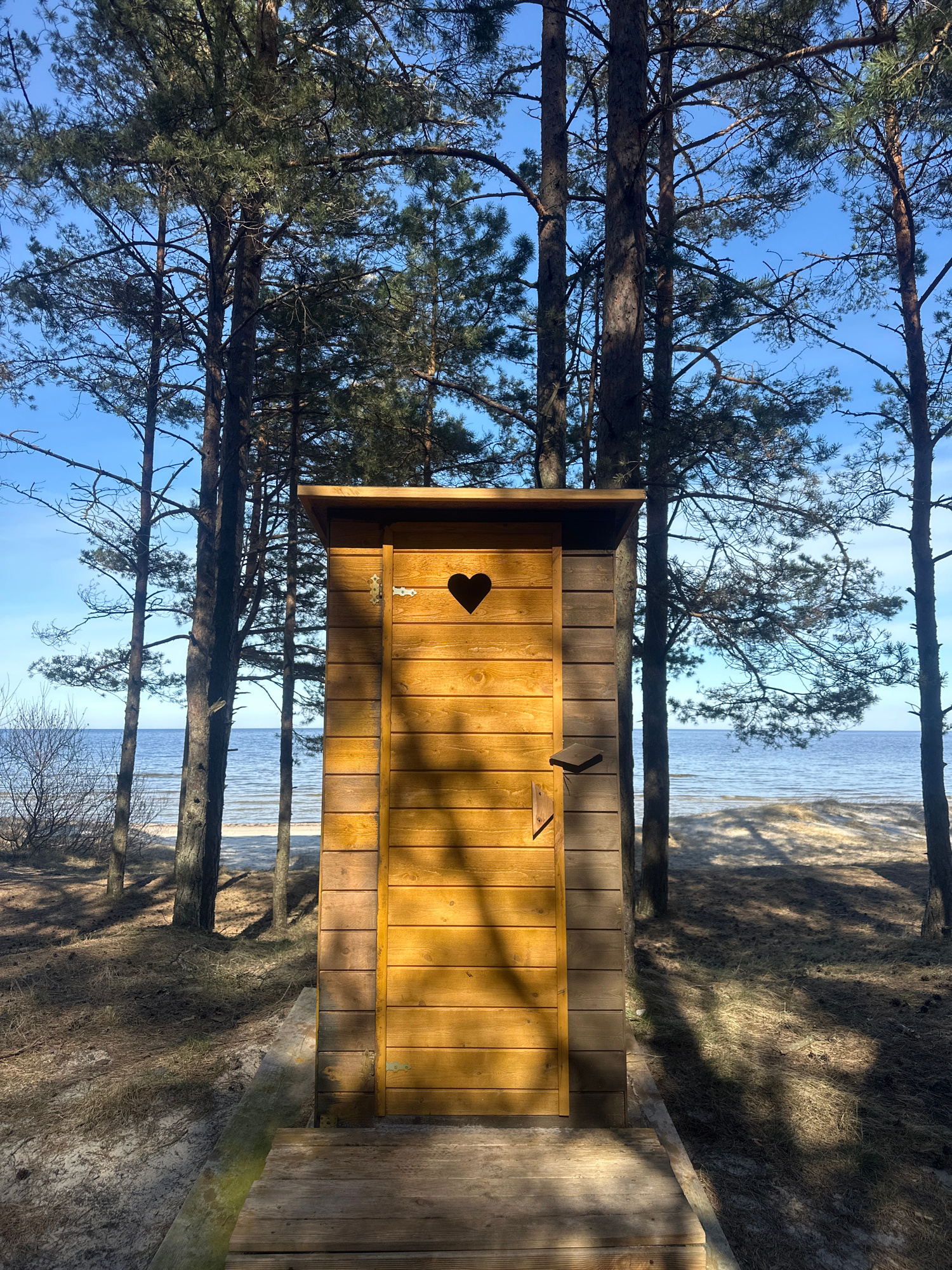 An upright, sunny outdoor scene depicts a rustic wooden outhouse situated among pine trees near a body of water. The outhouse, made of light-colored wooden planks, stands prominently in the foreground…read more