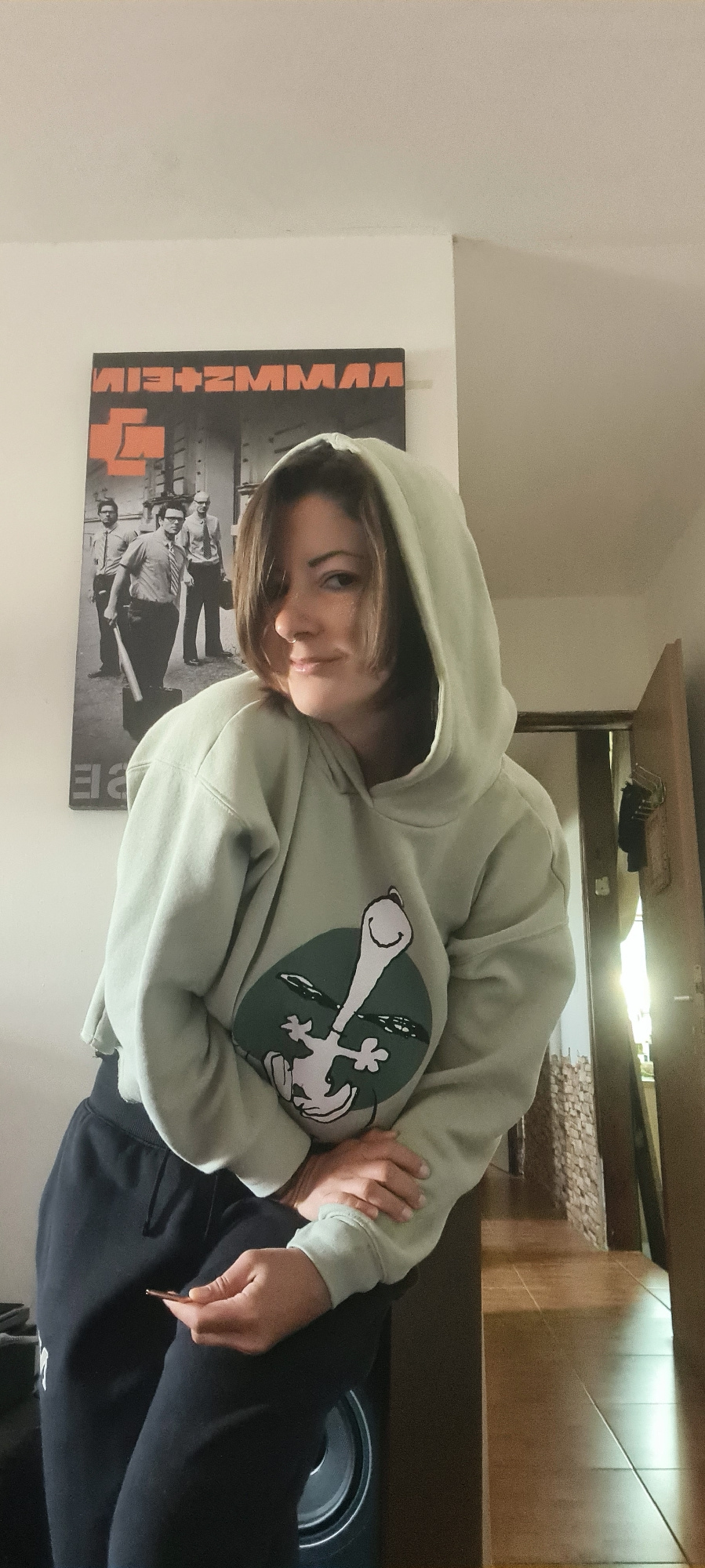 A young person is posing indoors, wearing a light green hoodie with a cartoon graphic, and black sweatpants. They are sitting on or next to a black object with a circular speaker. Behind them is a wal…read more