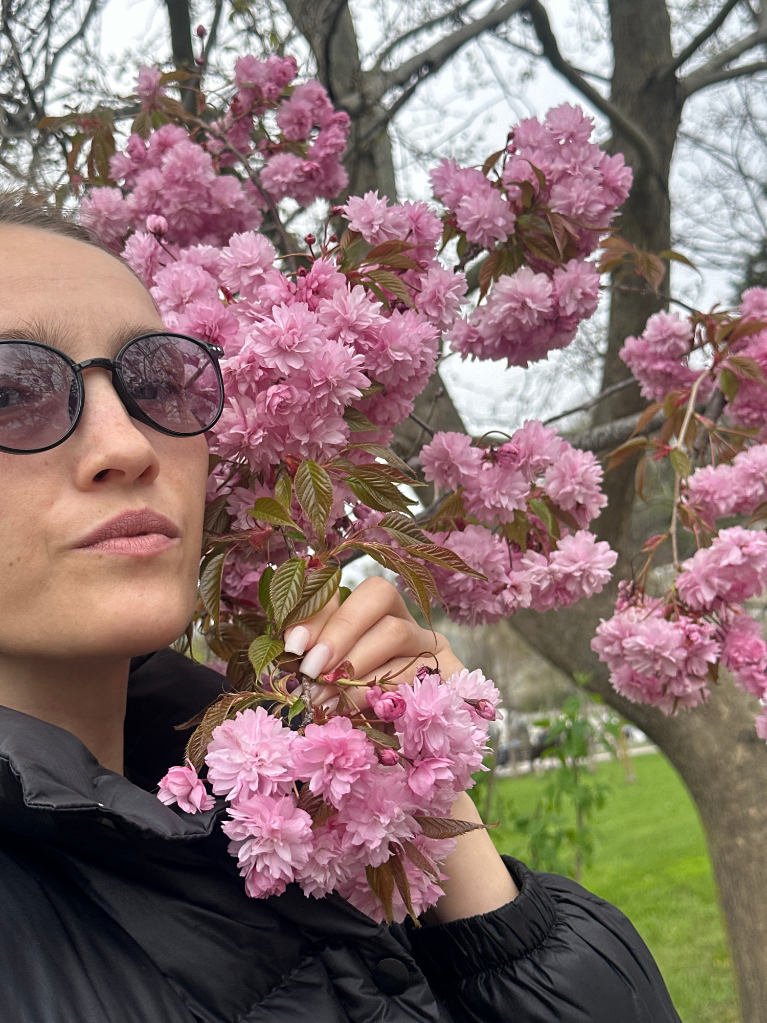 A photograph depicts a person wearing sunglasses, likely a woman, lying down amongst pink cherry blossom flowers. The person is wearing a black, puffy jacket, and their hand is gently holding a branch…read more