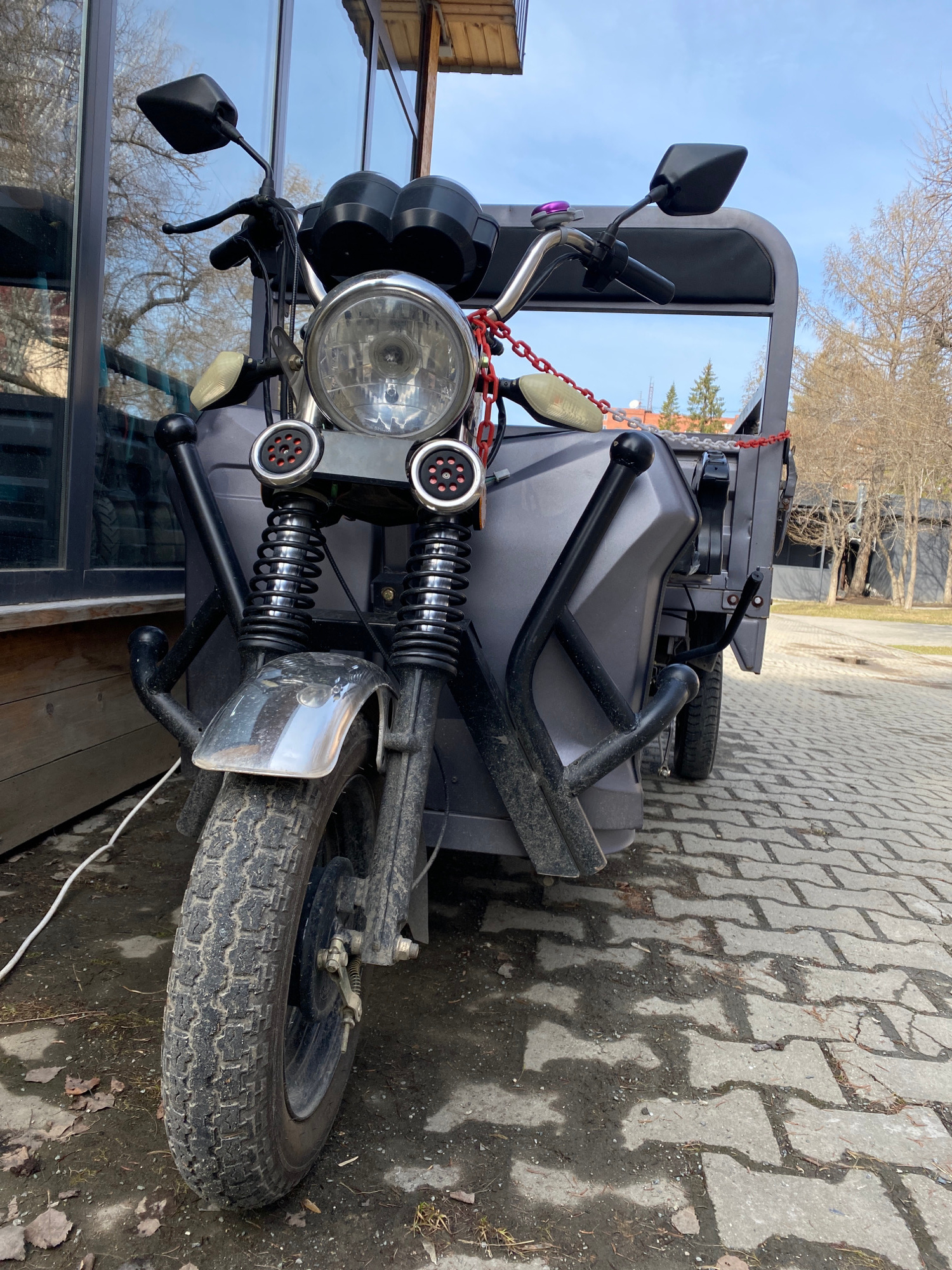 The image depicts a gray tricycle-like vehicle with a passenger area and a prominent headlight. It is equipped with spring-loaded shock absorbers, rearview mirrors, and a red chain. The vehicle is par…read more