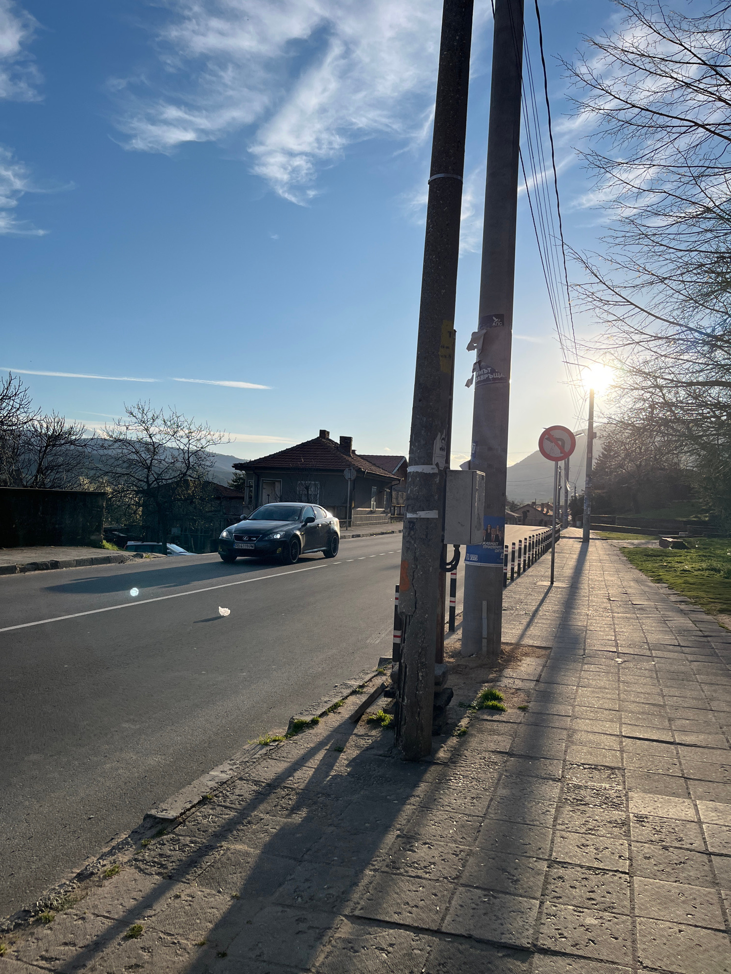 The image shows a street scene in Rozino, Bulgaria on a sunny day. A two-lane road is lined with a concrete sidewalk on the right. A black car is parked on the roadside. Overhead power lines are suppo…read more