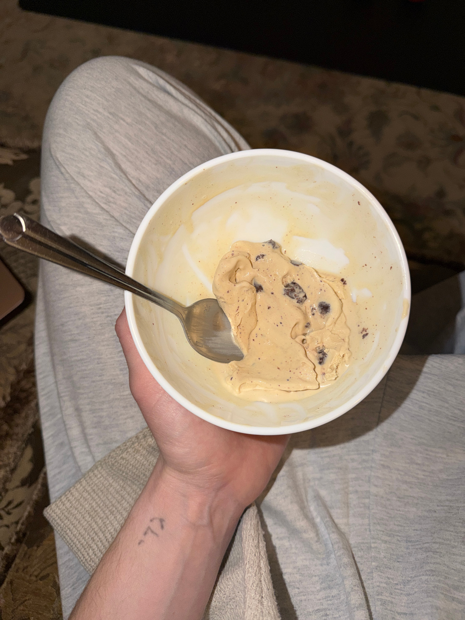 A person is holding a white bowl of partially eaten ice cream with chocolate chips. A silver spoon is inside the bowl. The person is wearing light gray sweatpants and a long-sleeved shirt. The backgro…read more