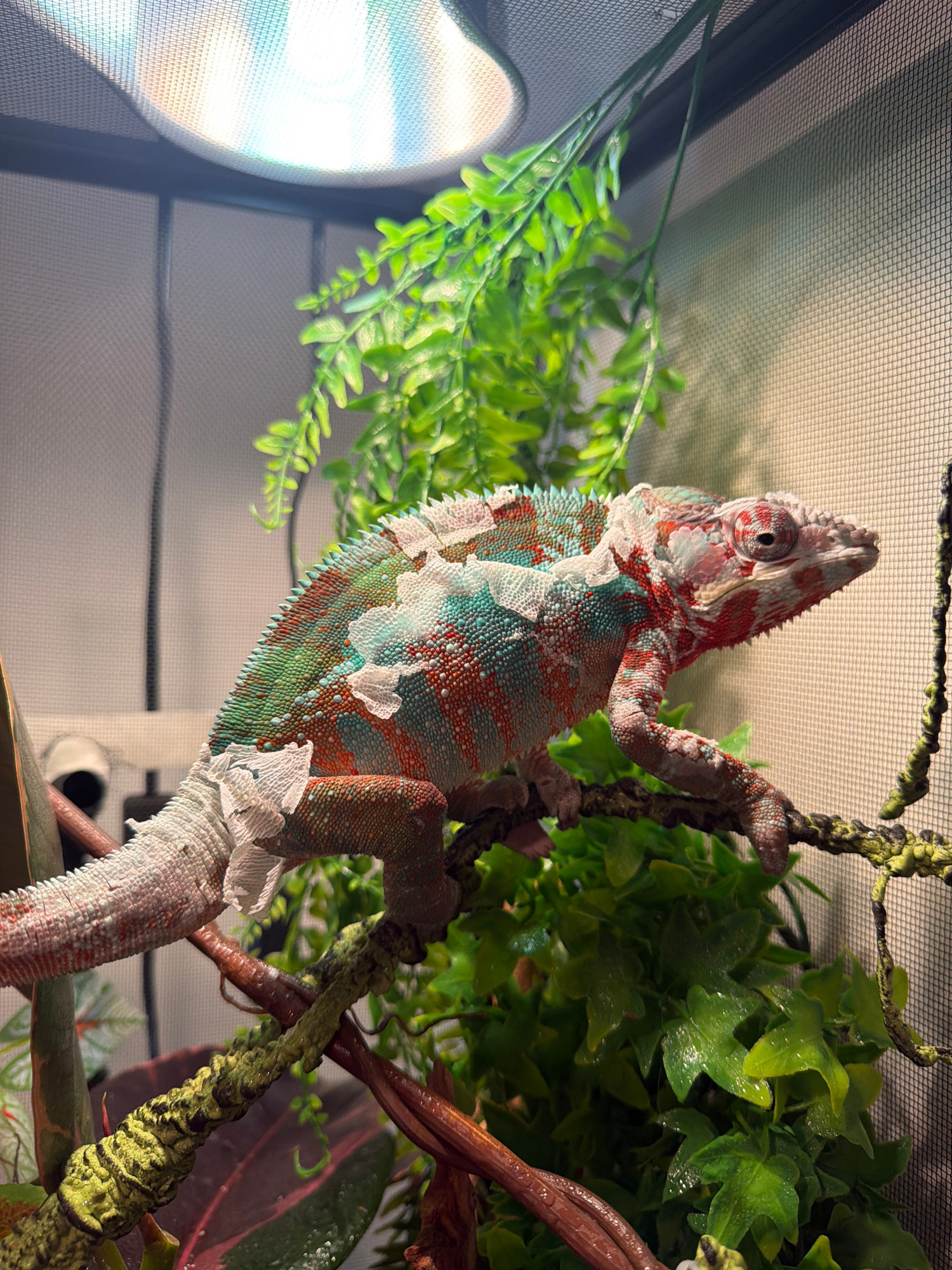 A chameleon is shedding its skin while clinging to a branch within its terrarium. The chameleon displays a blend of red, green, and blue coloration. The terrarium contains artificial foliage and branc…read more